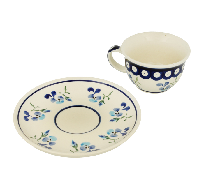 Filiżanka ze spodkiem, rozszerzana ku górze. Produkt ręcznie formowany i dekorowany w Zakładach Ceramicznych Bolesławiec.