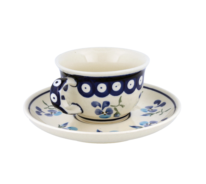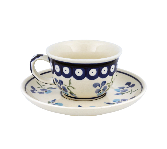 Klasyczna filiżanka ze spodkiem. Produkt ręcznie formowany i dekorowany w Zakładach Ceramicznych Bolesławiec.