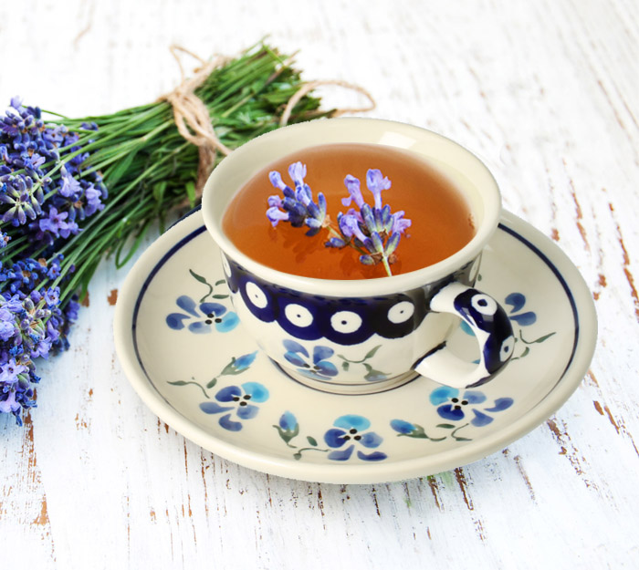 Filiżanka ze spodkiem w klasycznym kształcie. Produkt ręcznie formowany i dekorowany w Zakładach Ceramicznych Bolesławiec.