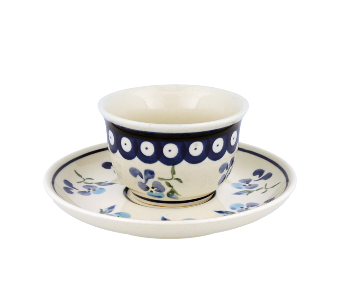 Mała filiżanka ze spodkiem w klasycznym kształcie. Produkt ręcznie formowany i dekorowany w Zakładach Ceramicznych Bolesławiec.