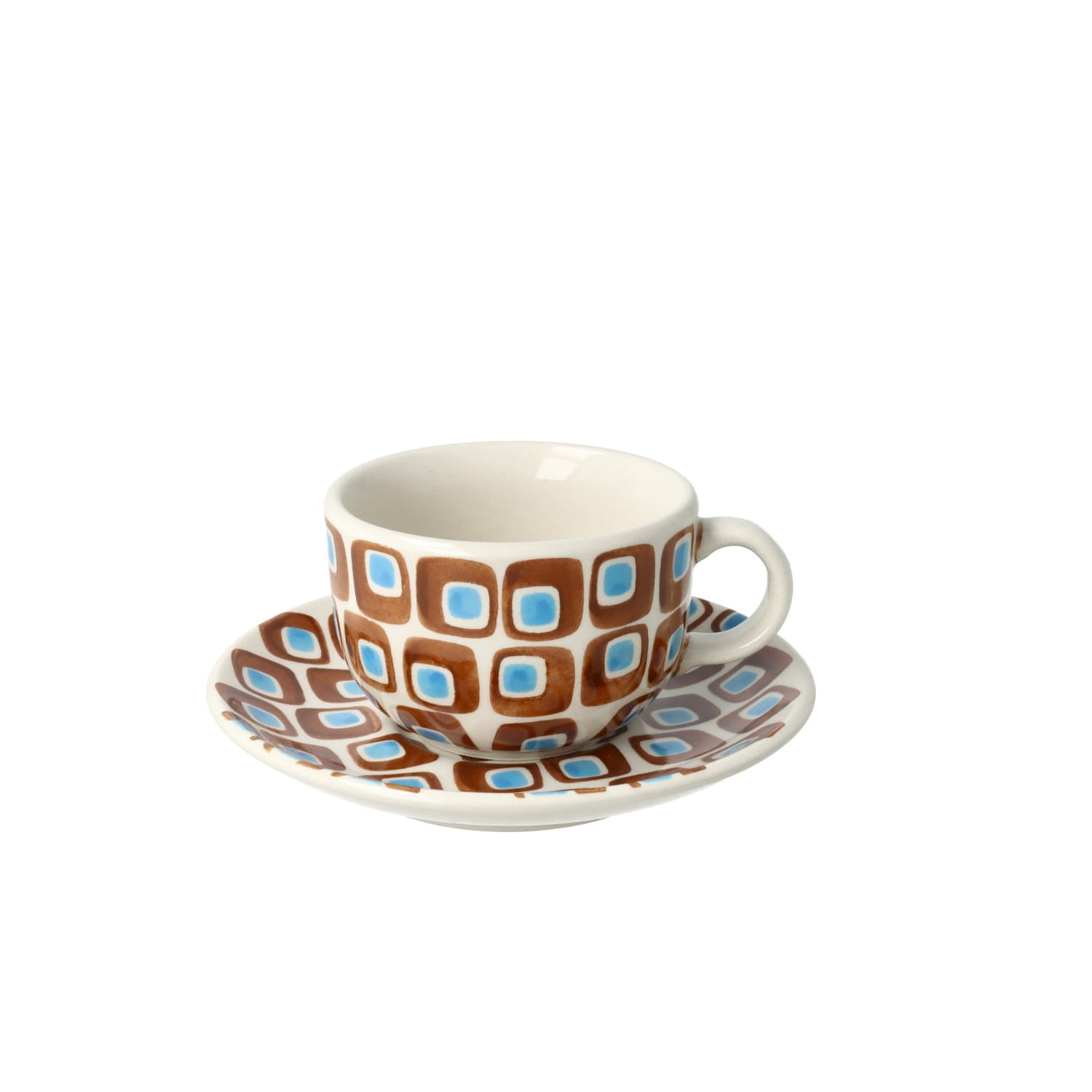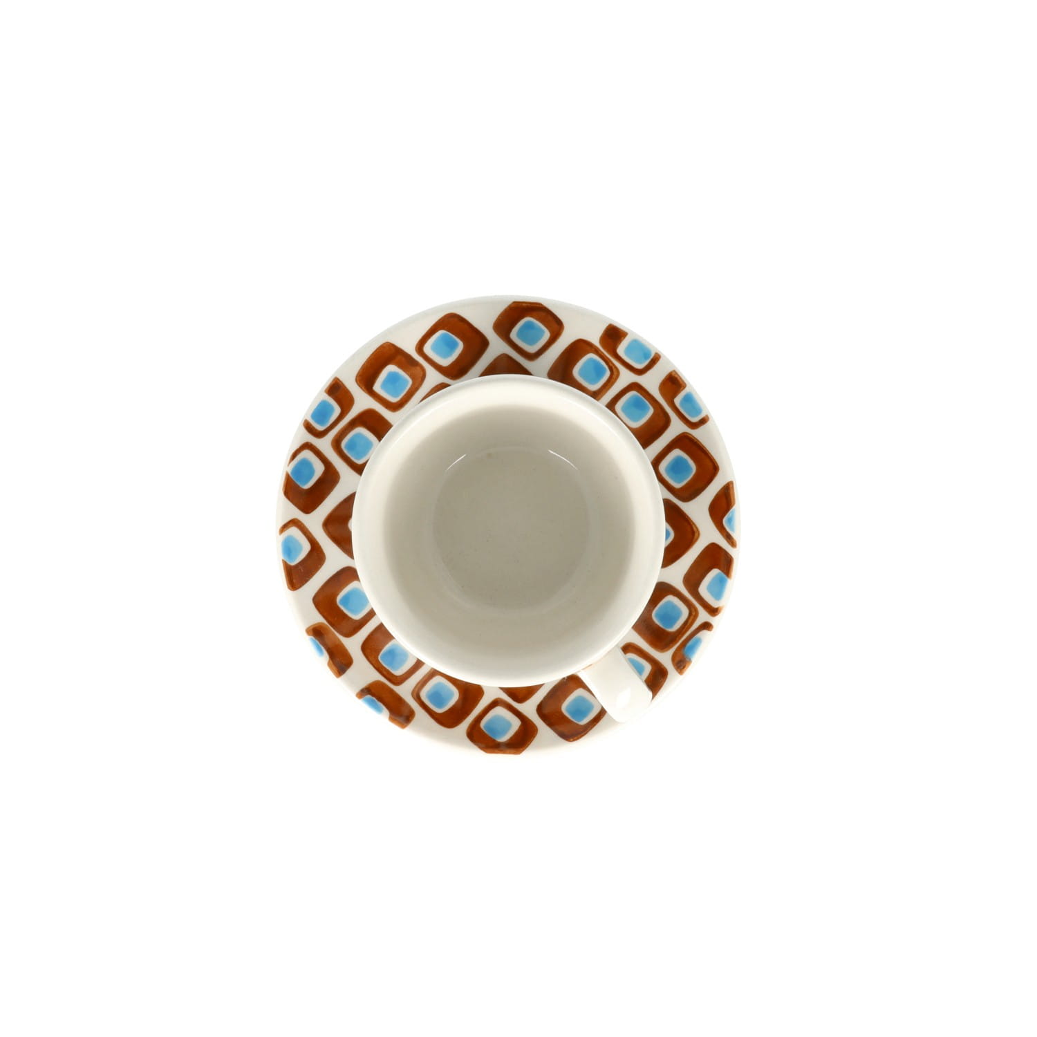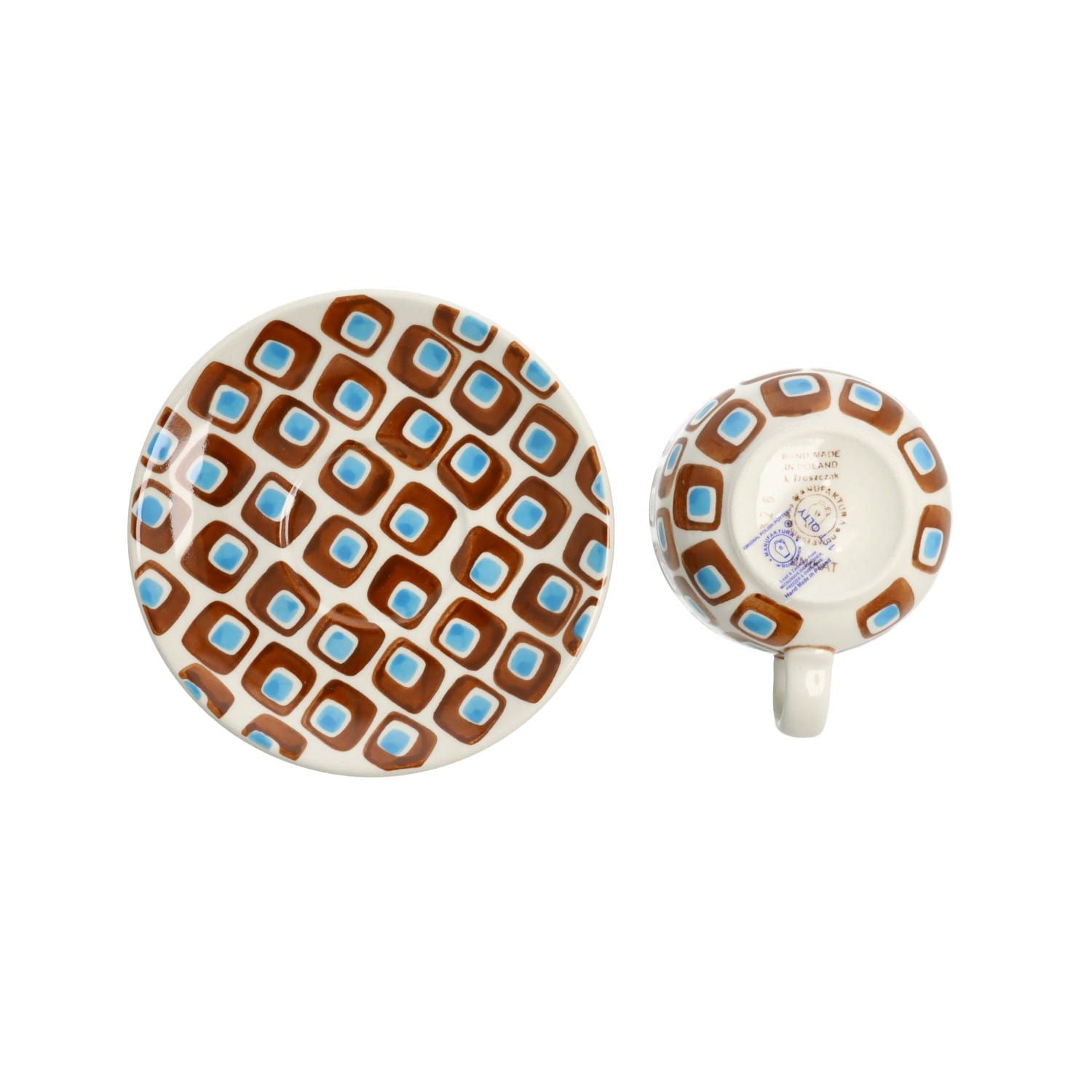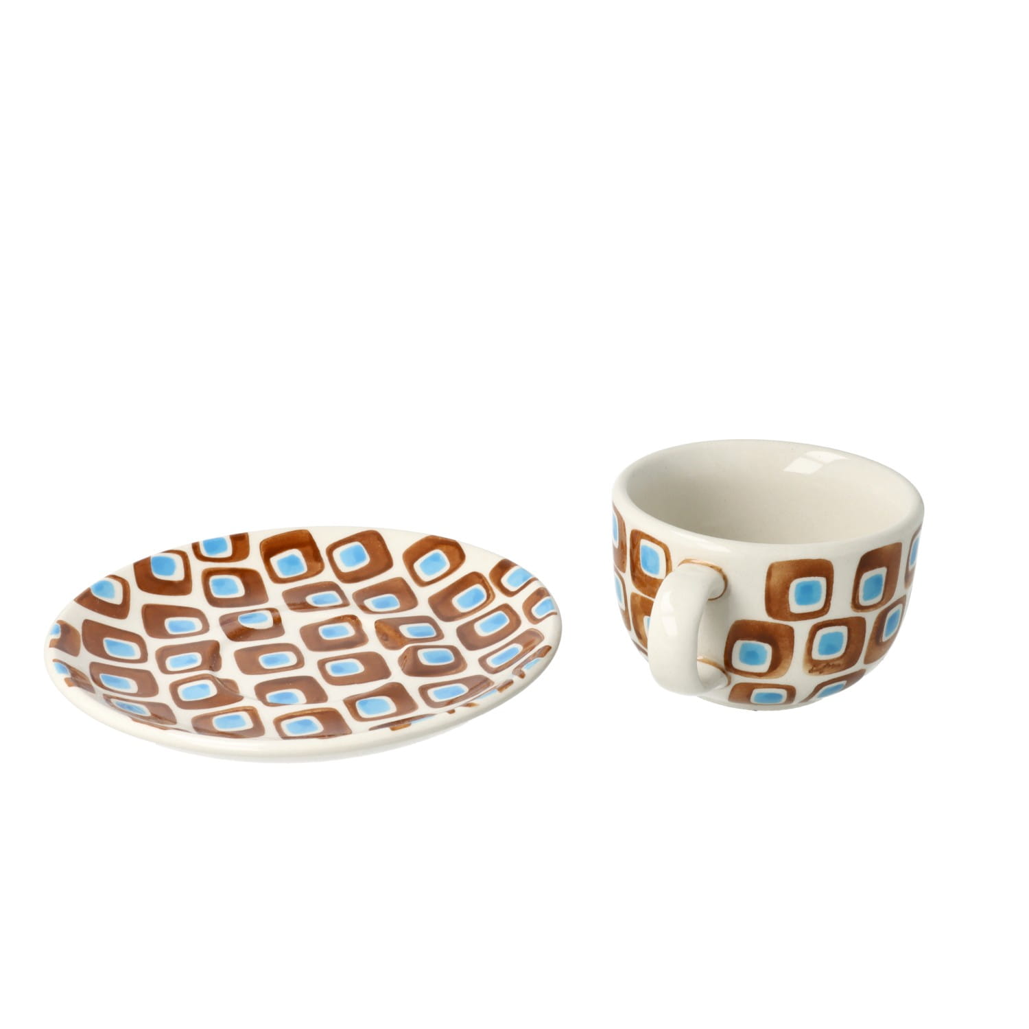 Filiżanka ze spodkiem z motywem kwadratów. Filiżanka sama jak i w zestawie będzie niepowtarzalną dekoracją dla każdego domu.