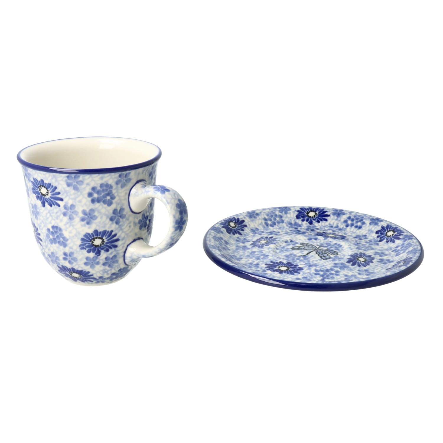 Zestaw filiżanka ze spodkiem i talerz. Produkt ręcznie formowany i dekorowany w Ceramice Artystycznej S.R.A. Bolesławiec.