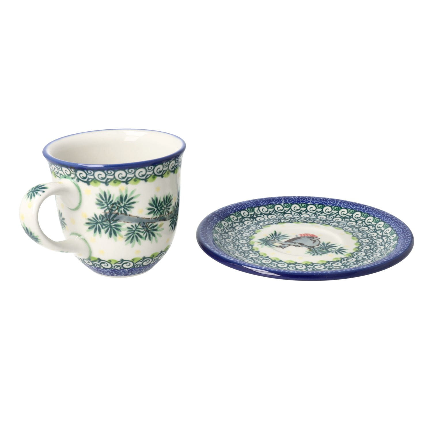 Filiżanka ze spodkiem z poszerzonym brzegiem. Produkt ręcznie formowany i dekorowany w Zakładach Ceramicznych Bolesławiec.