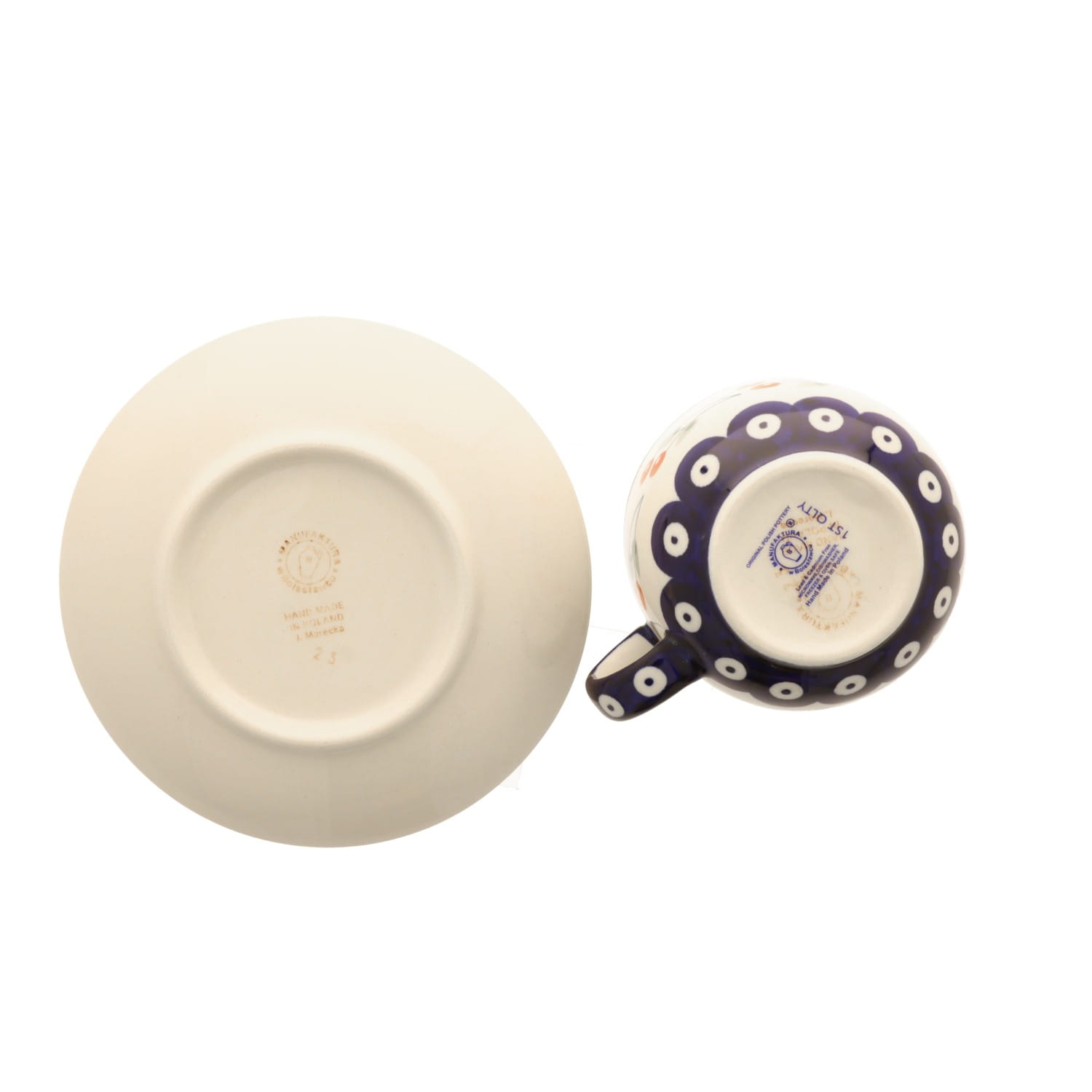Filiżanka z profilowanym uchem oraz spodkiem. Produkt ręcznie formowany i dekorowany w Ceramice Artystycznej S.R.A. Bolesławiec.