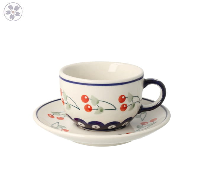 Filiżanka ze spodkiem z motywem wiśni. Filiżanka sama jak i w zestawie będzie niepowtarzalną dekoracją dla każdego domu. Idealny prezent dla konesera kawy.