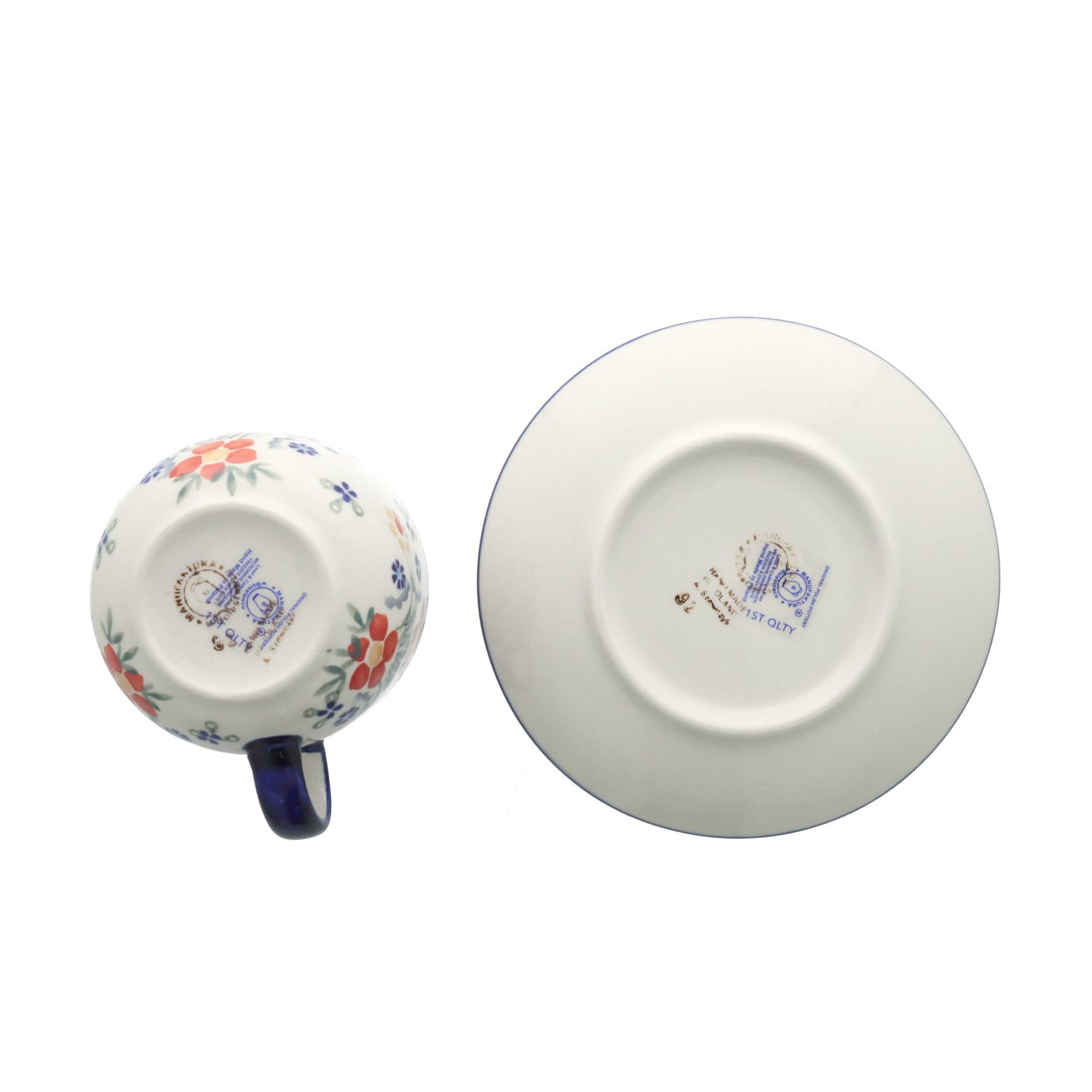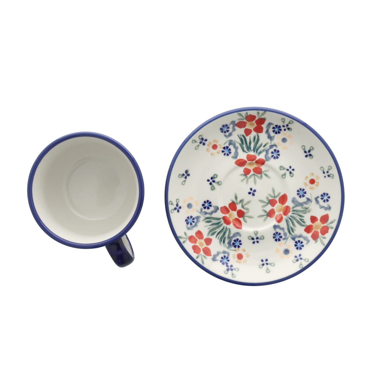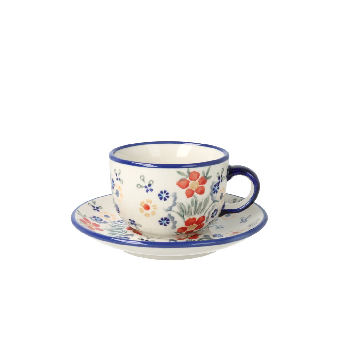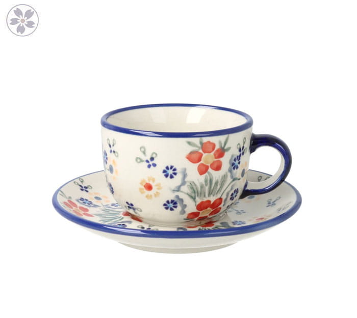 Filiżanka ze spodkiem "tulipan". Produkt ręcznie formowany i dekorowany w Zakładach Ceramicznych Bolesławiec.