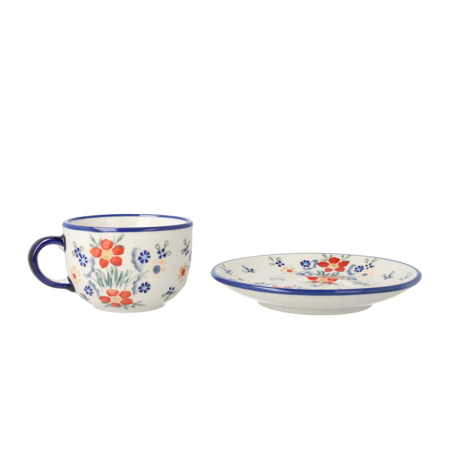 Filiżanka ze spodkiem w motyw kwiatów. Produkt ręcznie formowany i dekorowany w Manufakturze Galia Bolesławiec.