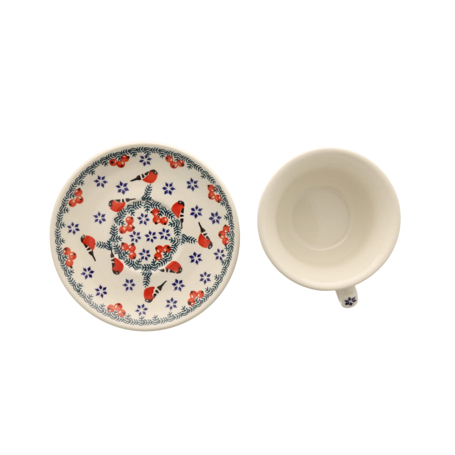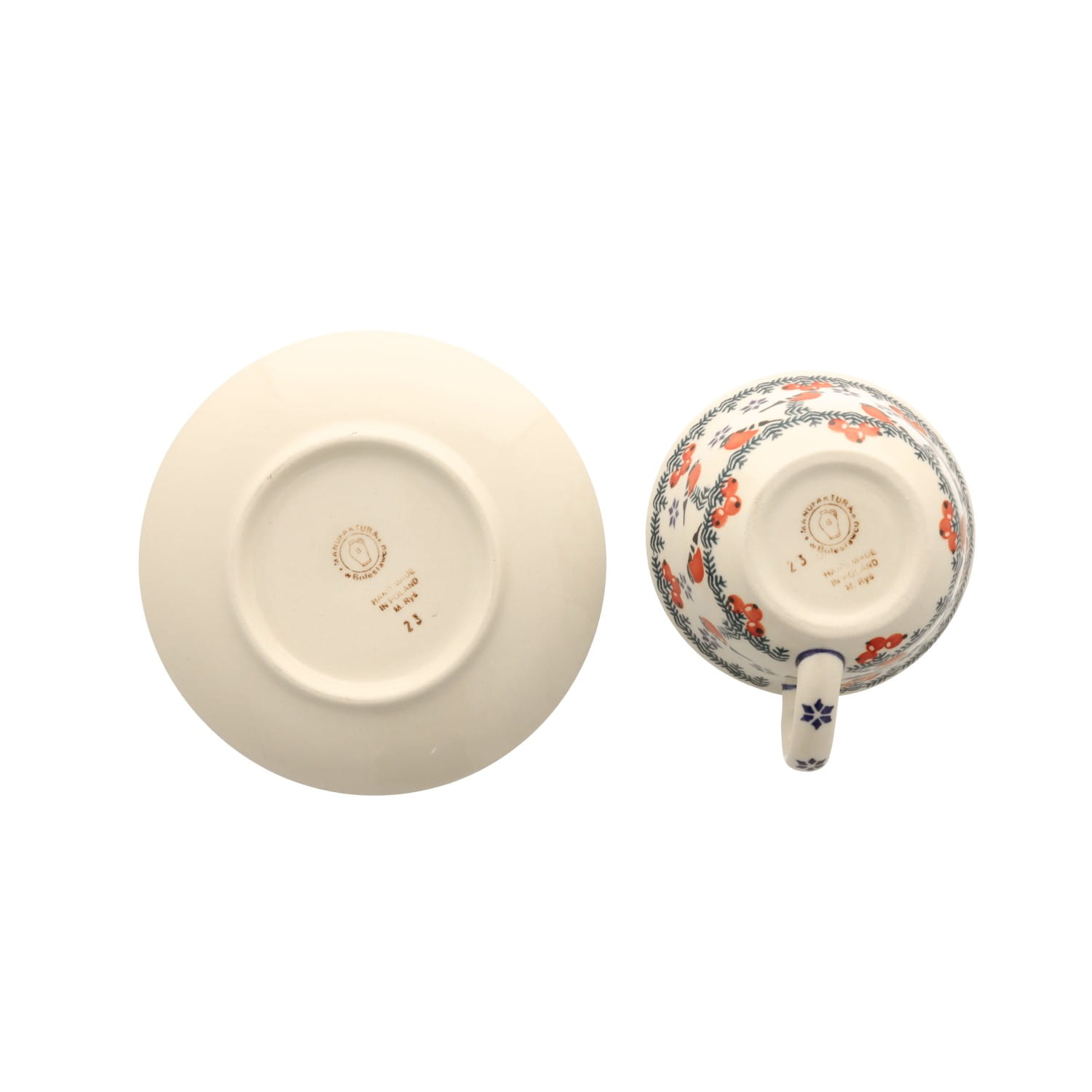 Filiżanka z profilowanym uchem oraz spodkiem. Produkt ręcznie formowany i dekorowany w Ceramice Artystycznej S.R.A. Bolesławiec.