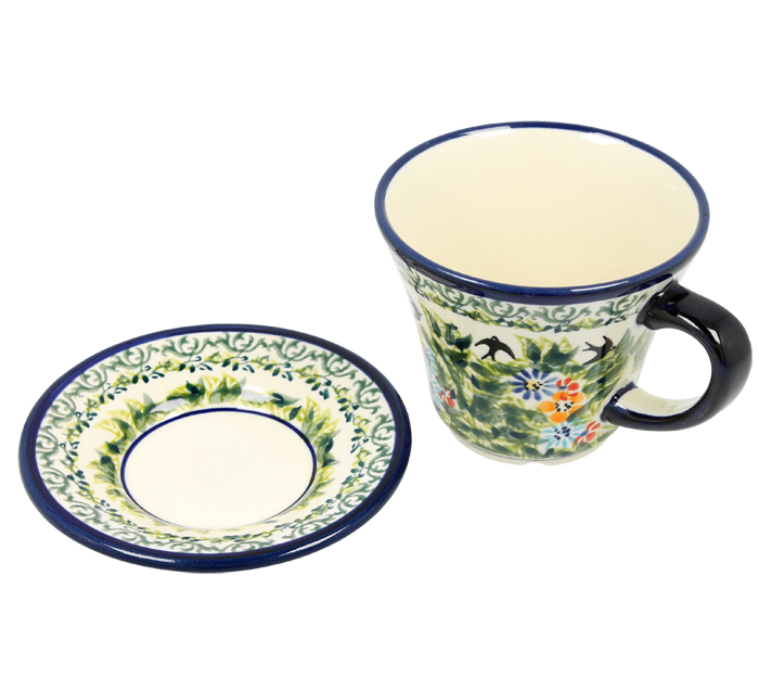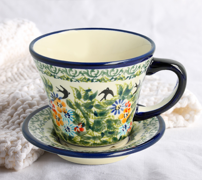Filiżanka ze spodkiem z poszerzonym brzegiem. Produkt ręcznie formowany i dekorowany w Zakładach Ceramicznych Bolesławiec.