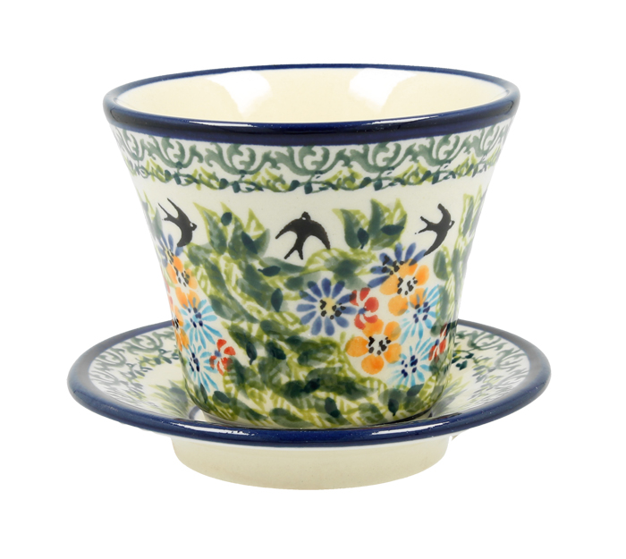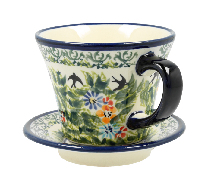 Filiżanka ze spodkiem z poszerzanym brzegiem. Produkt ręcznie formowany i dekorowany w Zakładach Ceramicznych Bolesławiec.