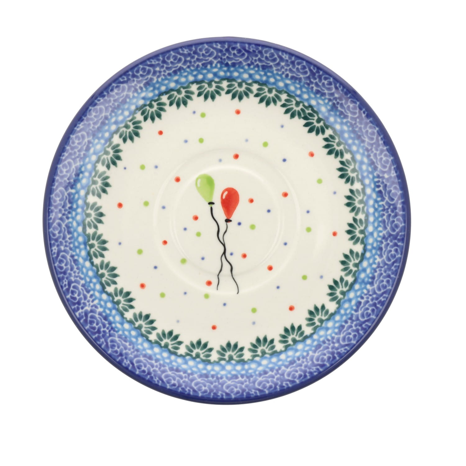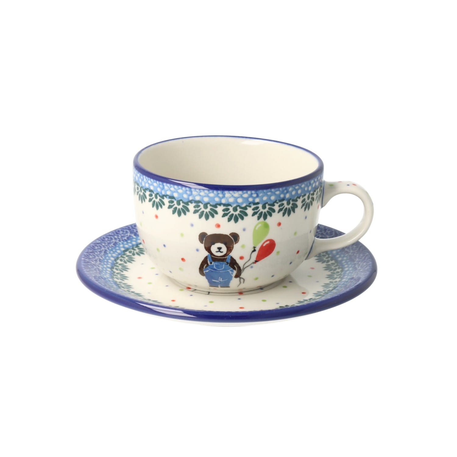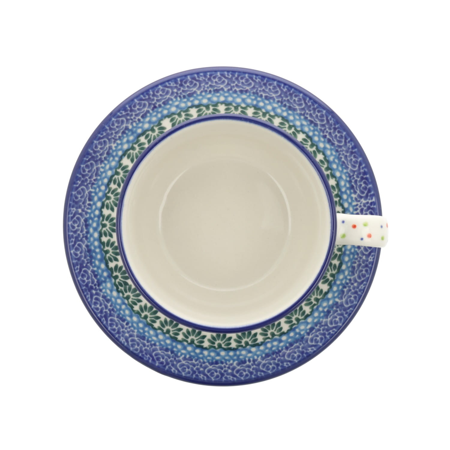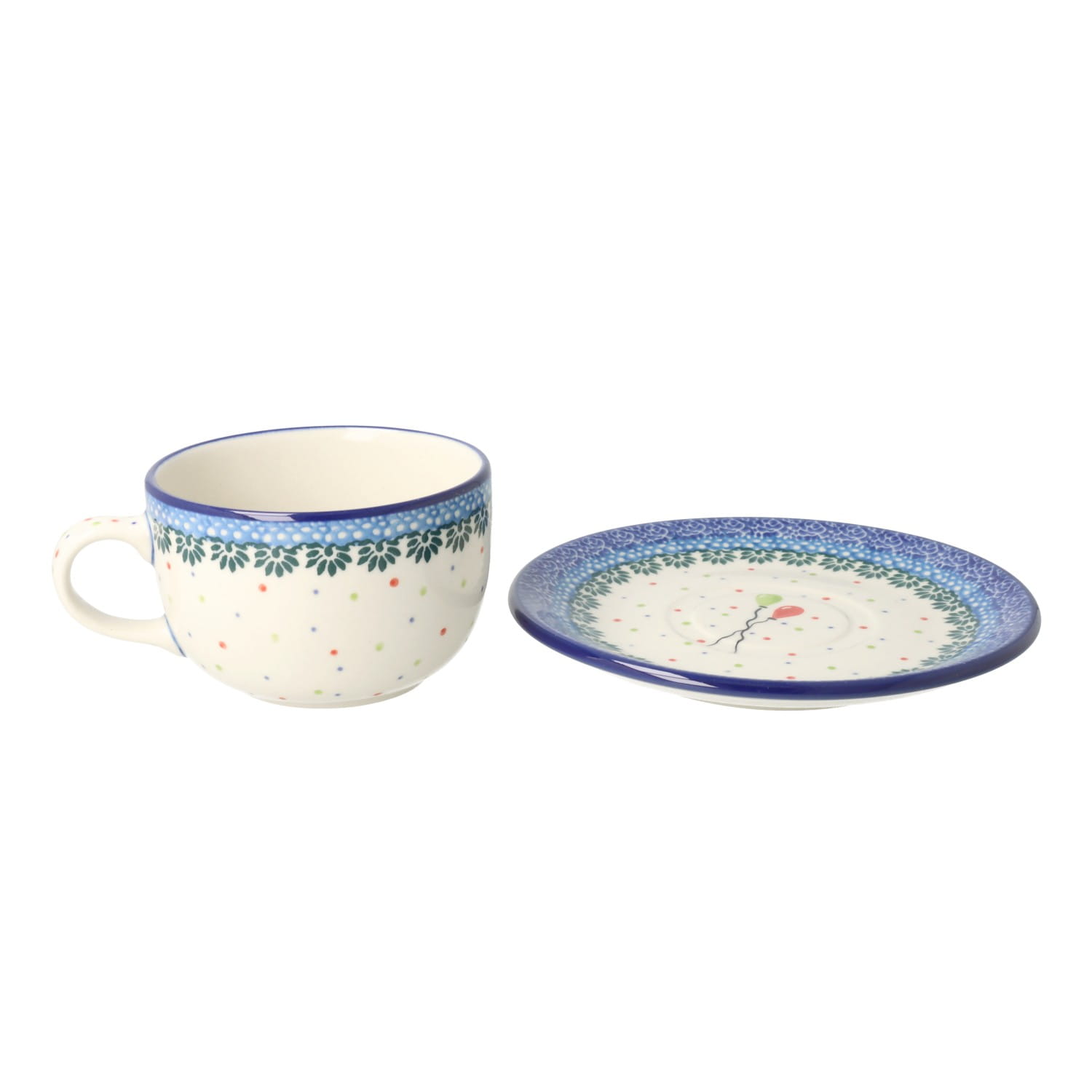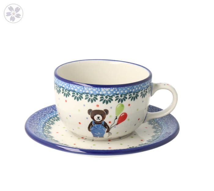 Filiżanka ze spodkiem z poszerzonym brzegiem. Produkt ręcznie formowany i dekorowany w Zakładach Ceramicznych Bolesławiec.