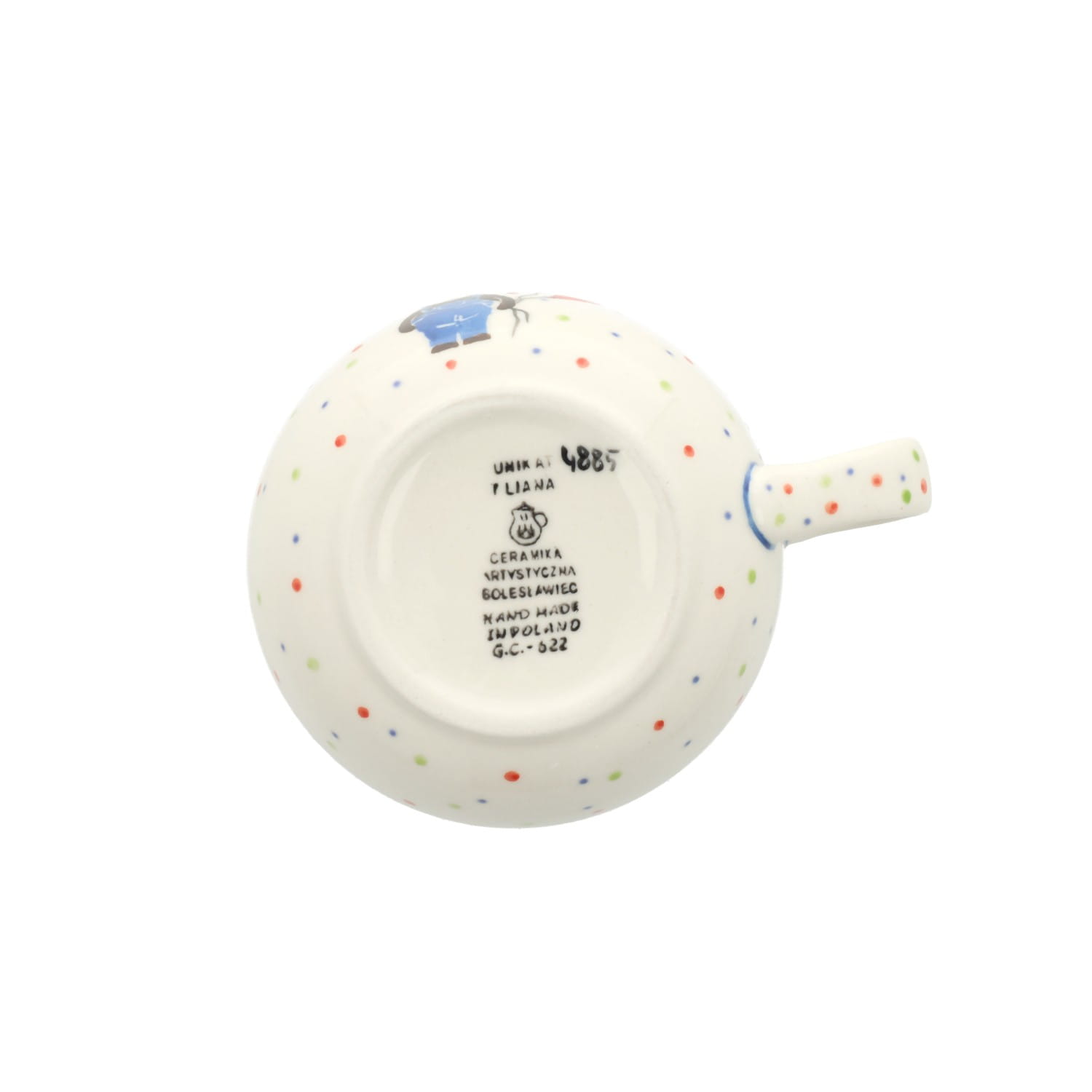 Mały kubeczek z uchem. Produkt ręcznie formowany i dekorowany w Ceramice Artystycznej S.R.A. Bolesławiec.