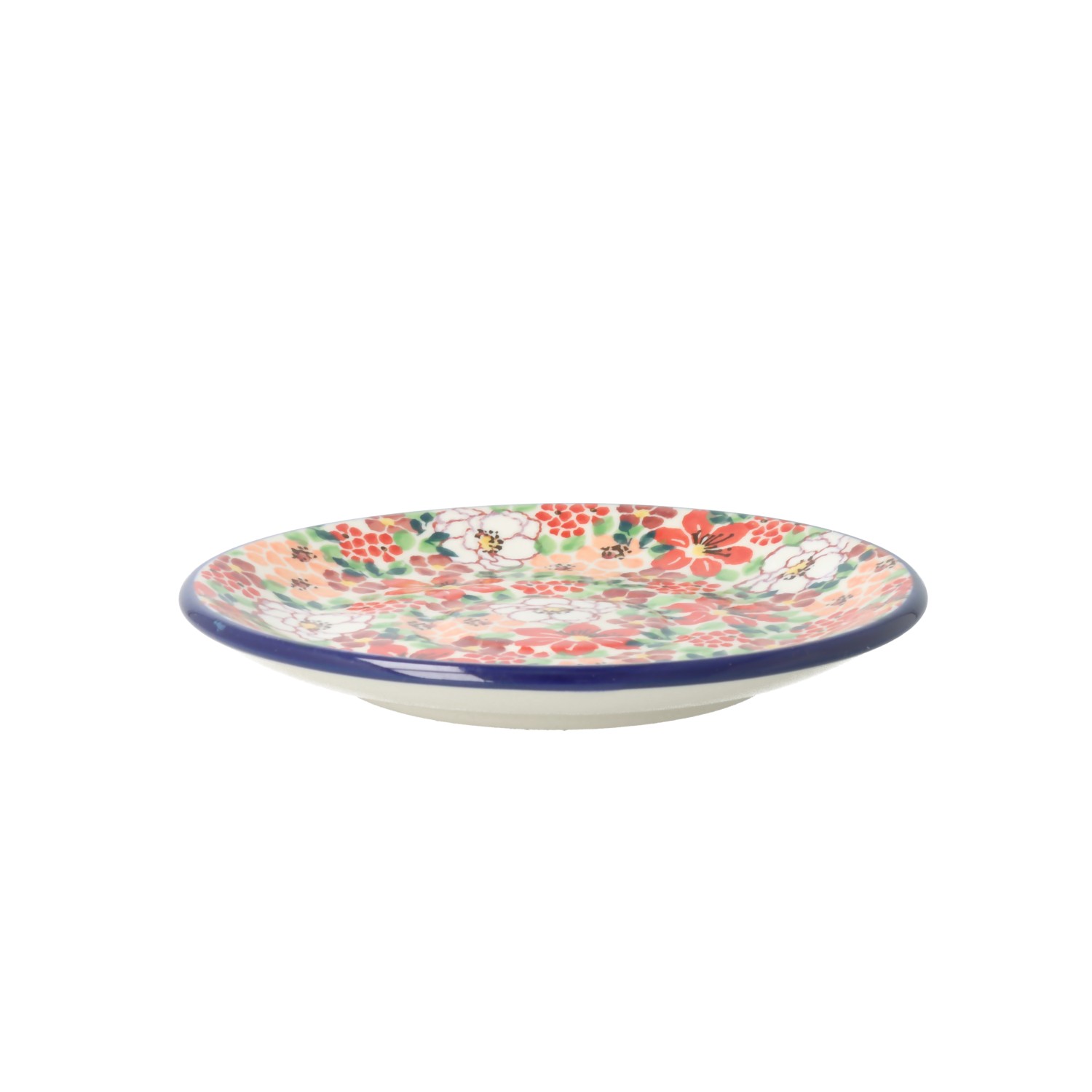 Płaski talerz deserowy. Produkt ręcznie formowany i dekorowany w Ceramice Artystycznej S.R.A. Bolesławiec.