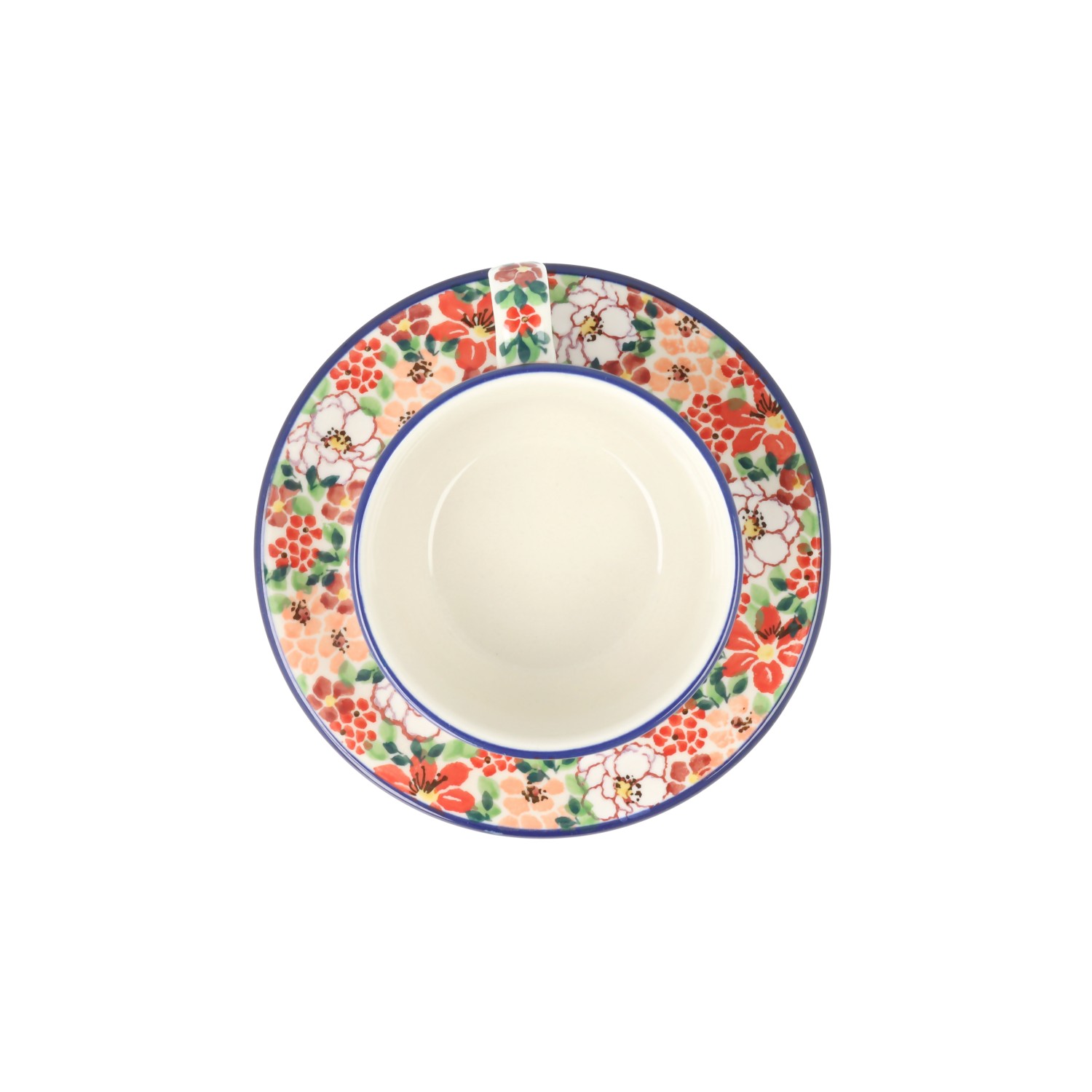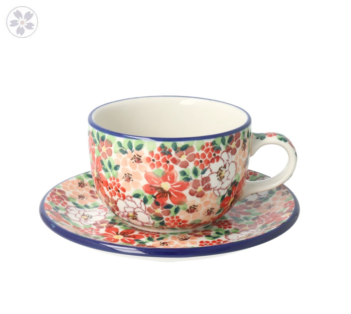 Filiżanka ze spodkiem z poszerzonym brzegiem. Produkt ręcznie formowany i dekorowany w Zakładach Ceramicznych Bolesławiec.