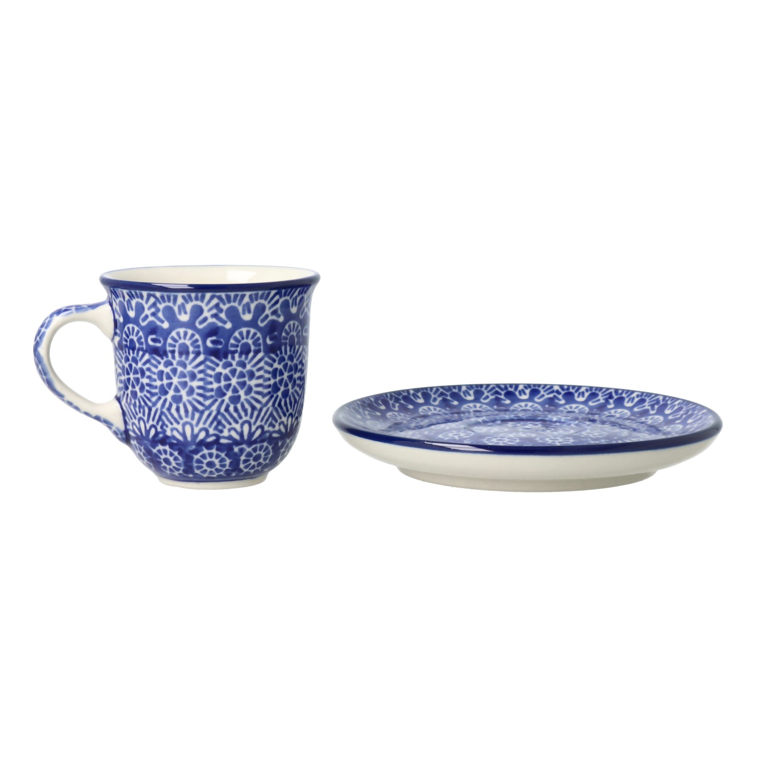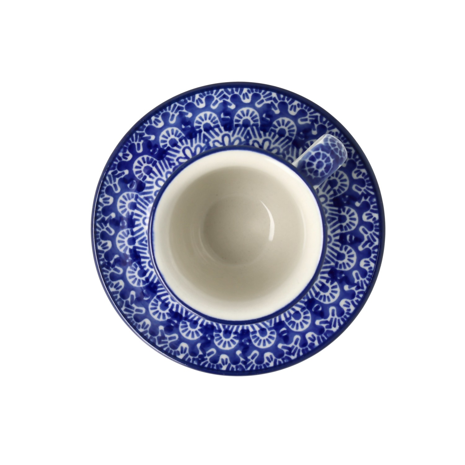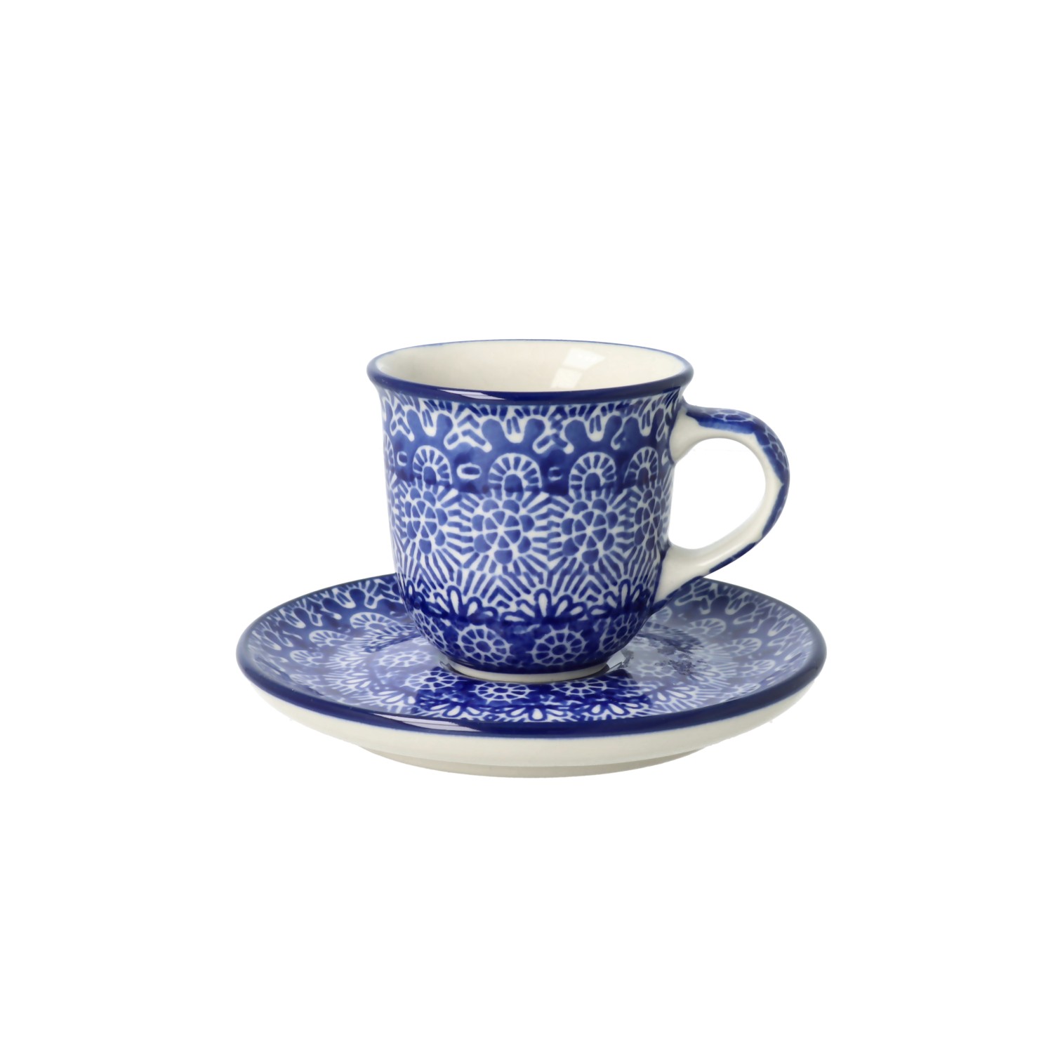 Filiżanka ze spodkiem z poszerzonym brzegiem. Produkt ręcznie formowany i dekorowany w Zakładach Ceramicznych Bolesławiec.