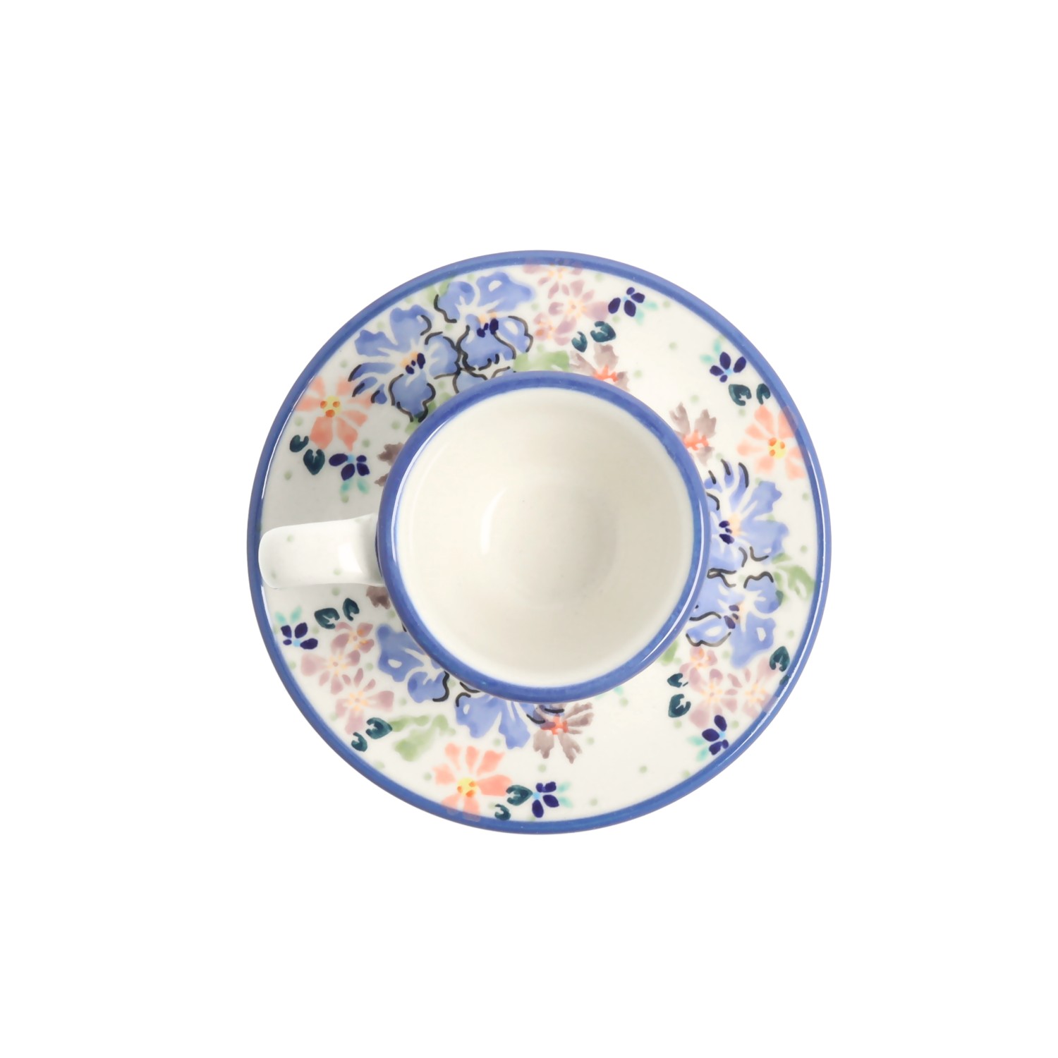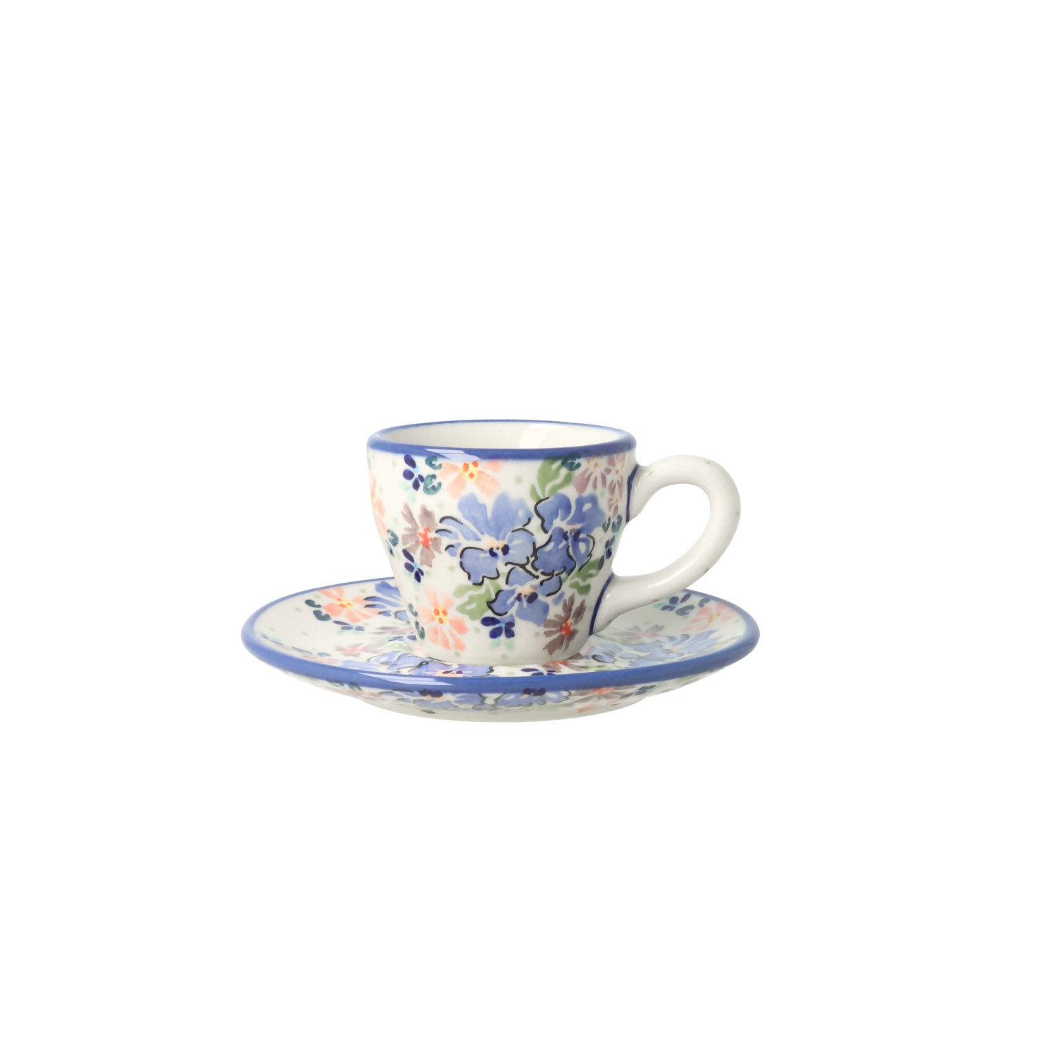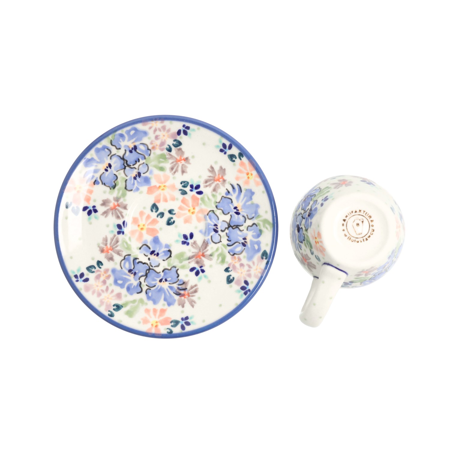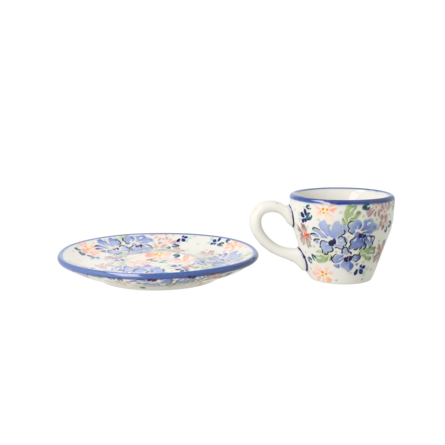 Mała filiżanka ze spodkiem. Produkt ręcznie formowany i dekorowany w Zakładach Ceramicznych Bolesławiec.