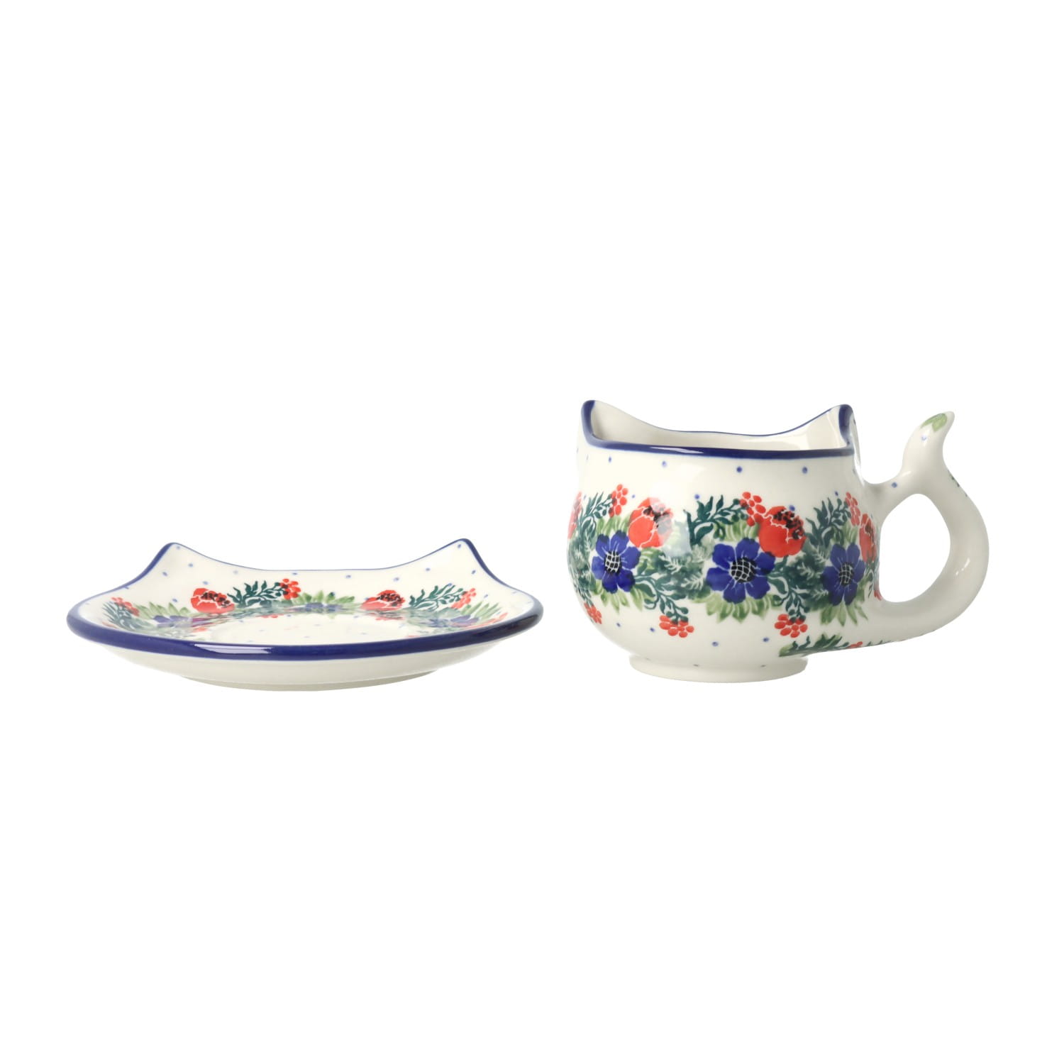 Zestaw filiżanka ze spodkiem i talerz. Produkt ręcznie formowany i dekorowany w Ceramice Artystycznej S.R.A. Bolesławiec.