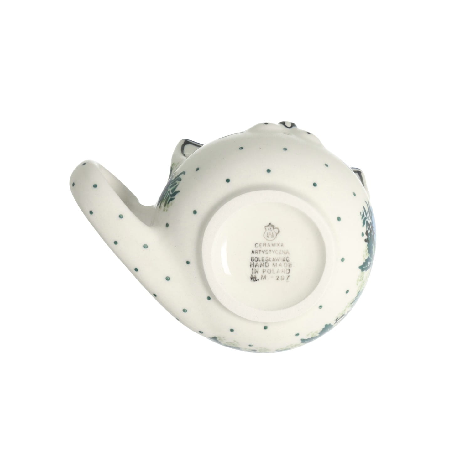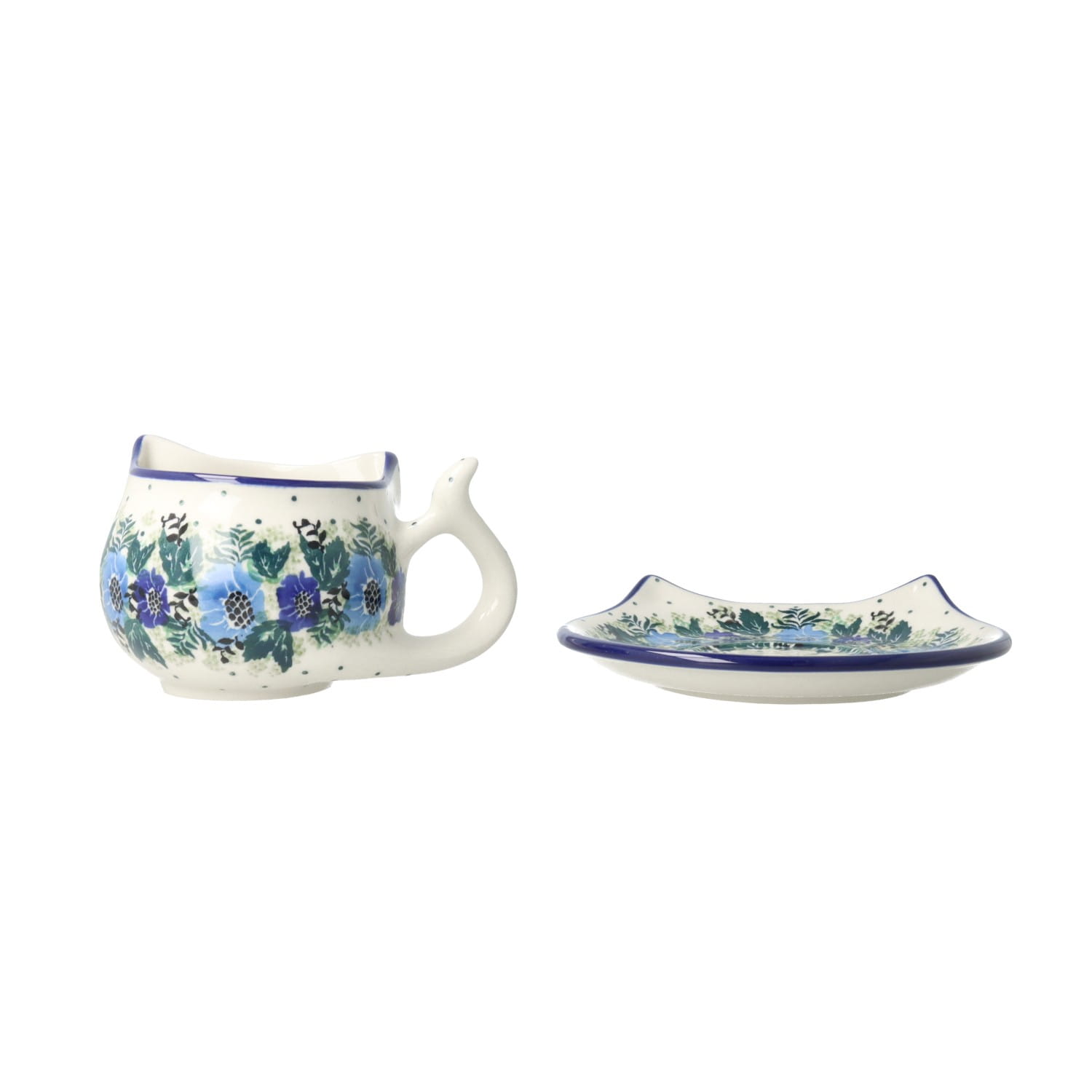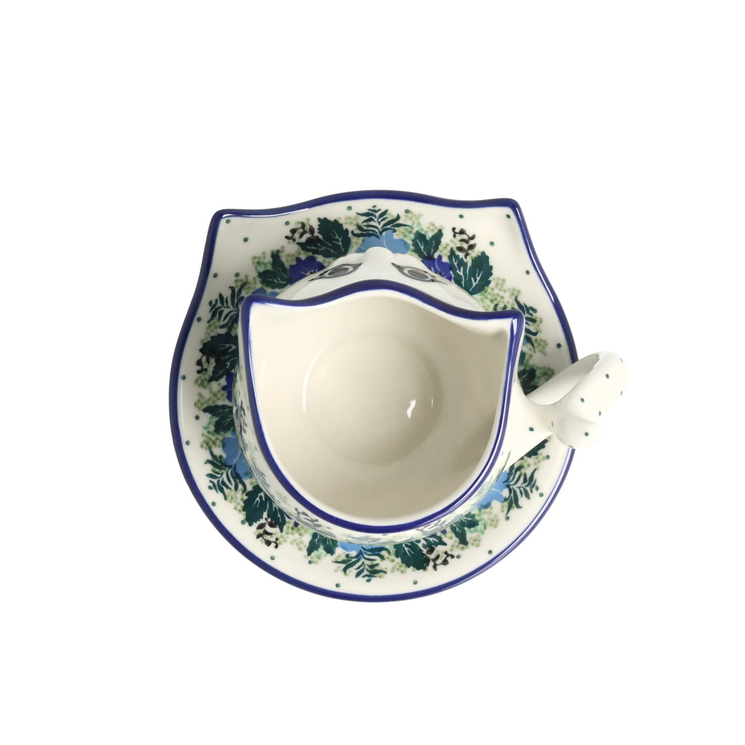 Filiżanka kot ze spodkiem. Produkt ręcznie formowany i dekorowany w Ceramice Artystycznej S.R.A. Bolesławiec.