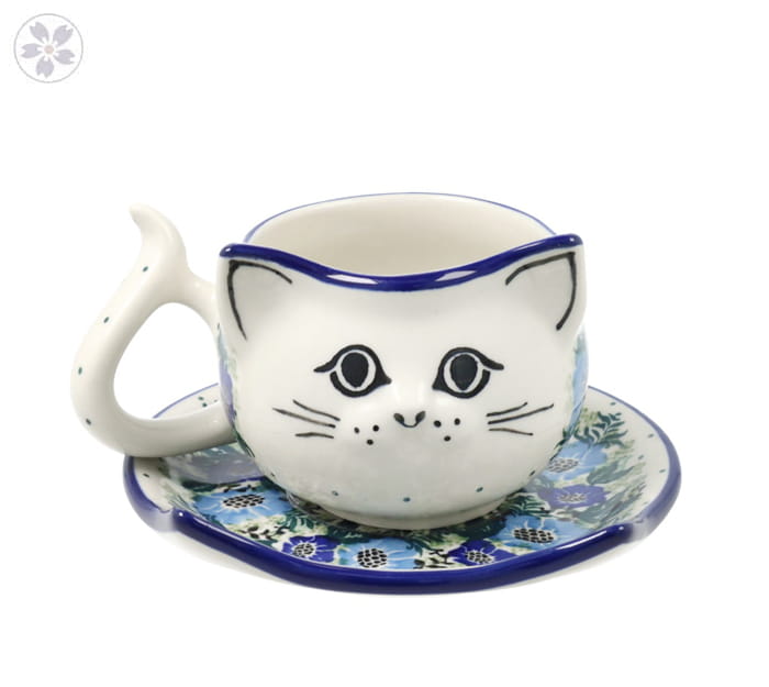 Filiżanka ze spodkiem z motywem kocim. Produkt ręcznie formowany i dekorowany w Manufakturze Galia Bolesławiec.