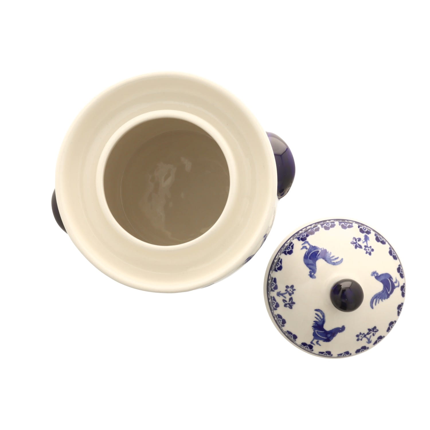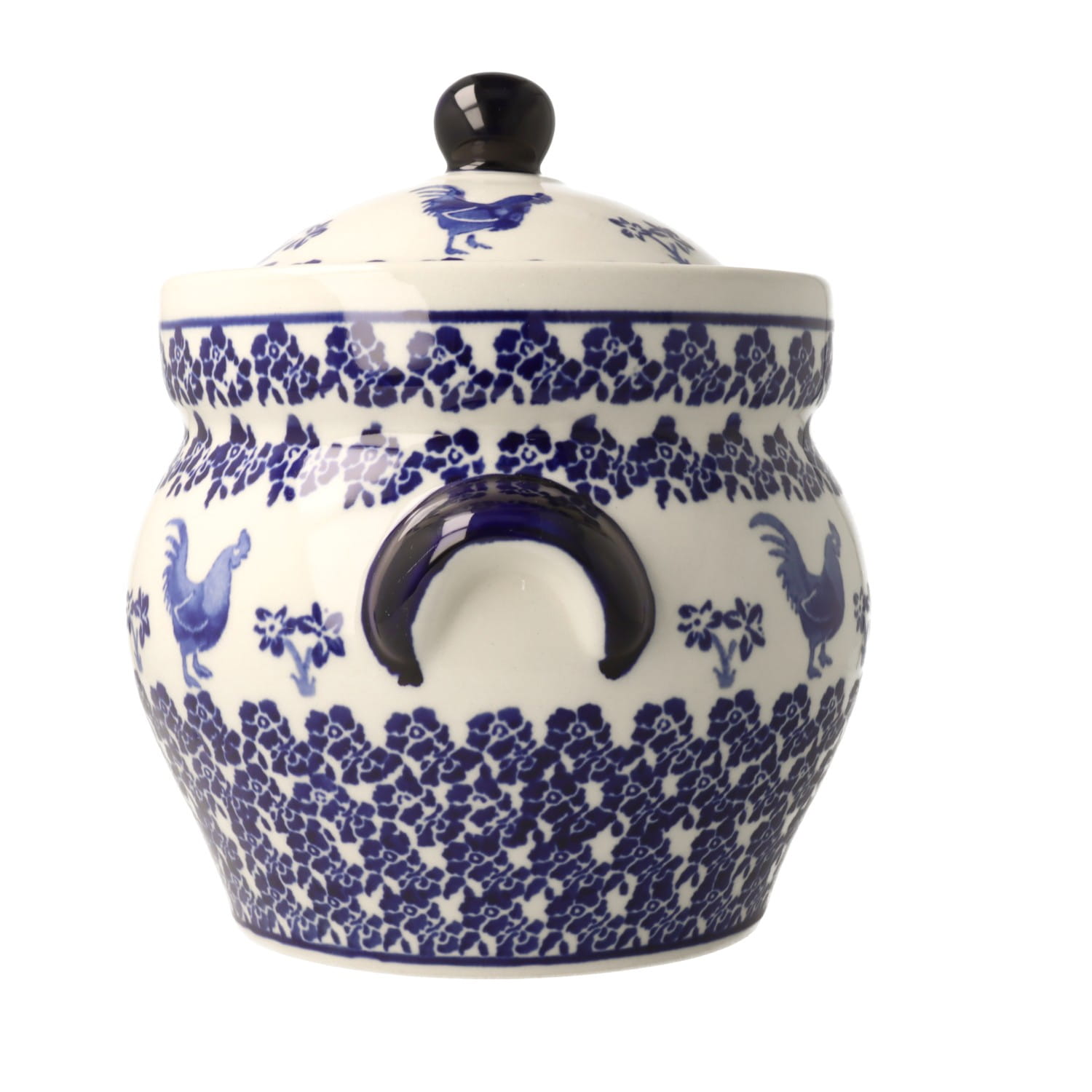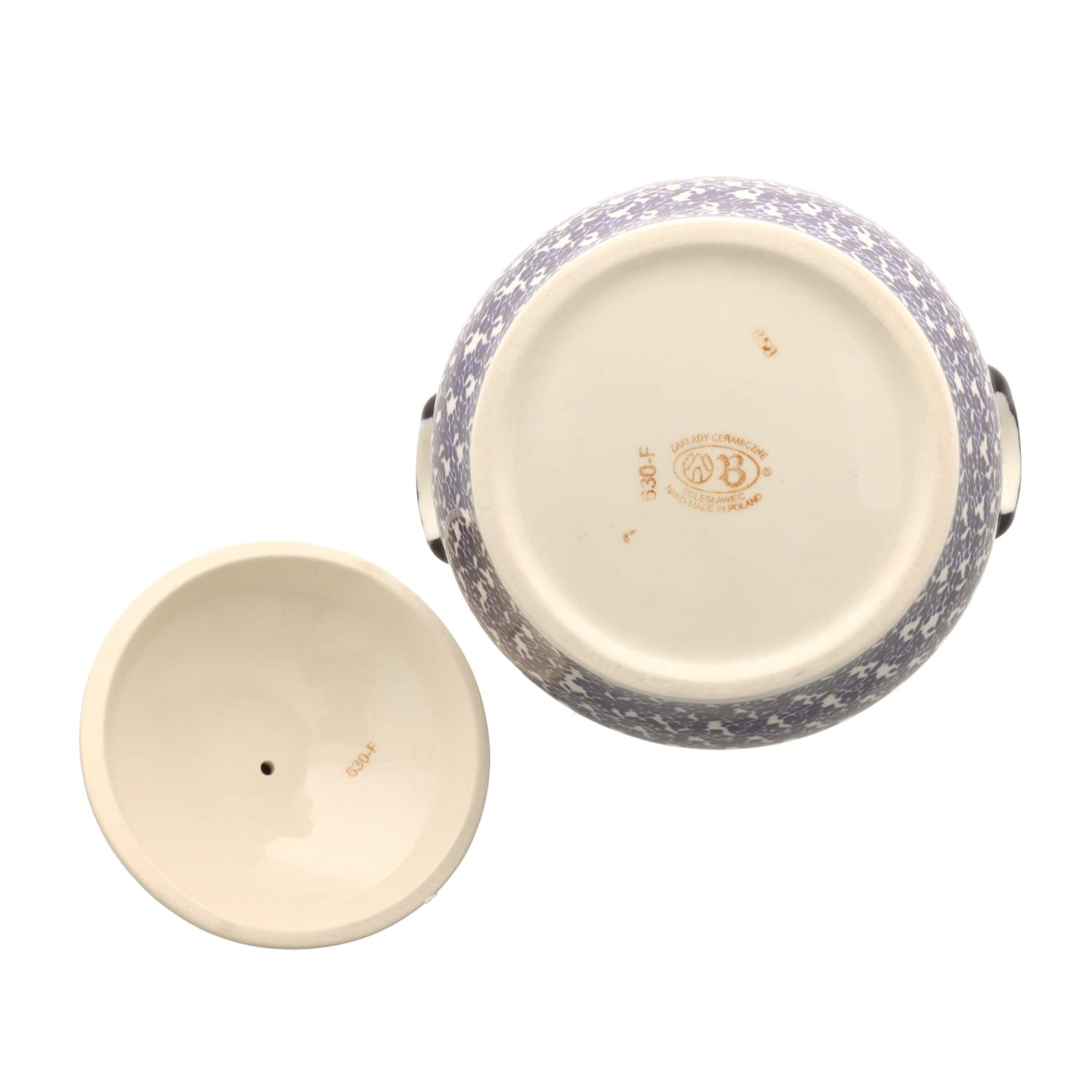 Okrągła cukiernica z otworem na łyżkę. Produkt ręcznie formowany i dekorowany w Zakładach Ceramicznych Bolesławiec.