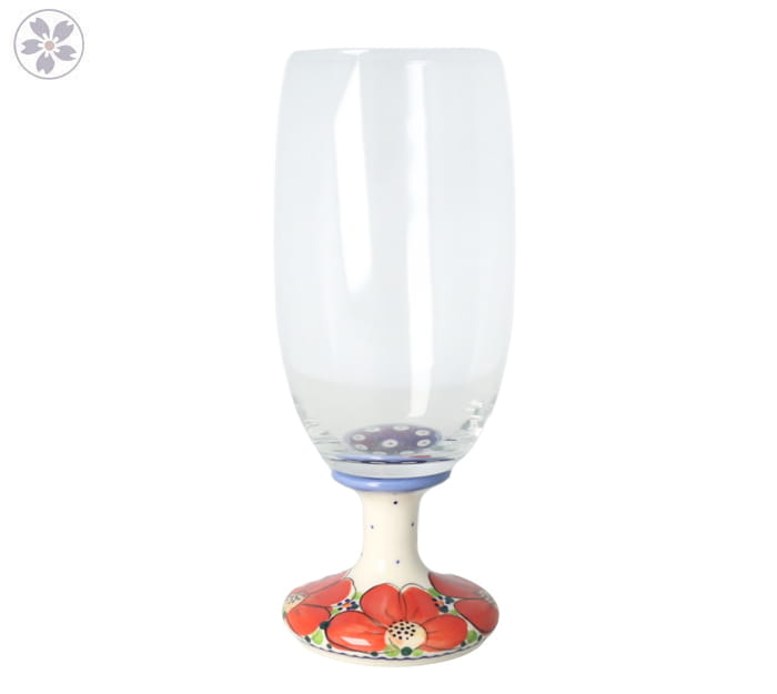 Połączenie szklanej czarki kieliszka z ręcznie malowaną, ceramiczną nóżką, nadaje mu niepowtarzalnego uroku.