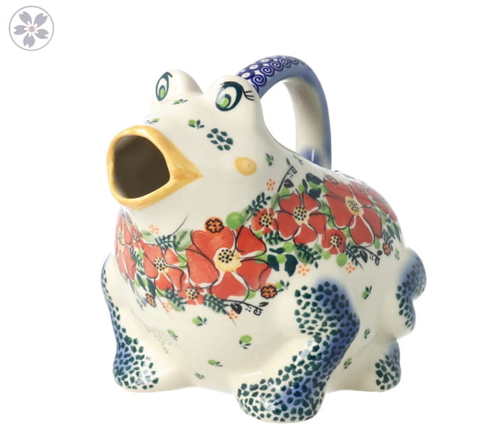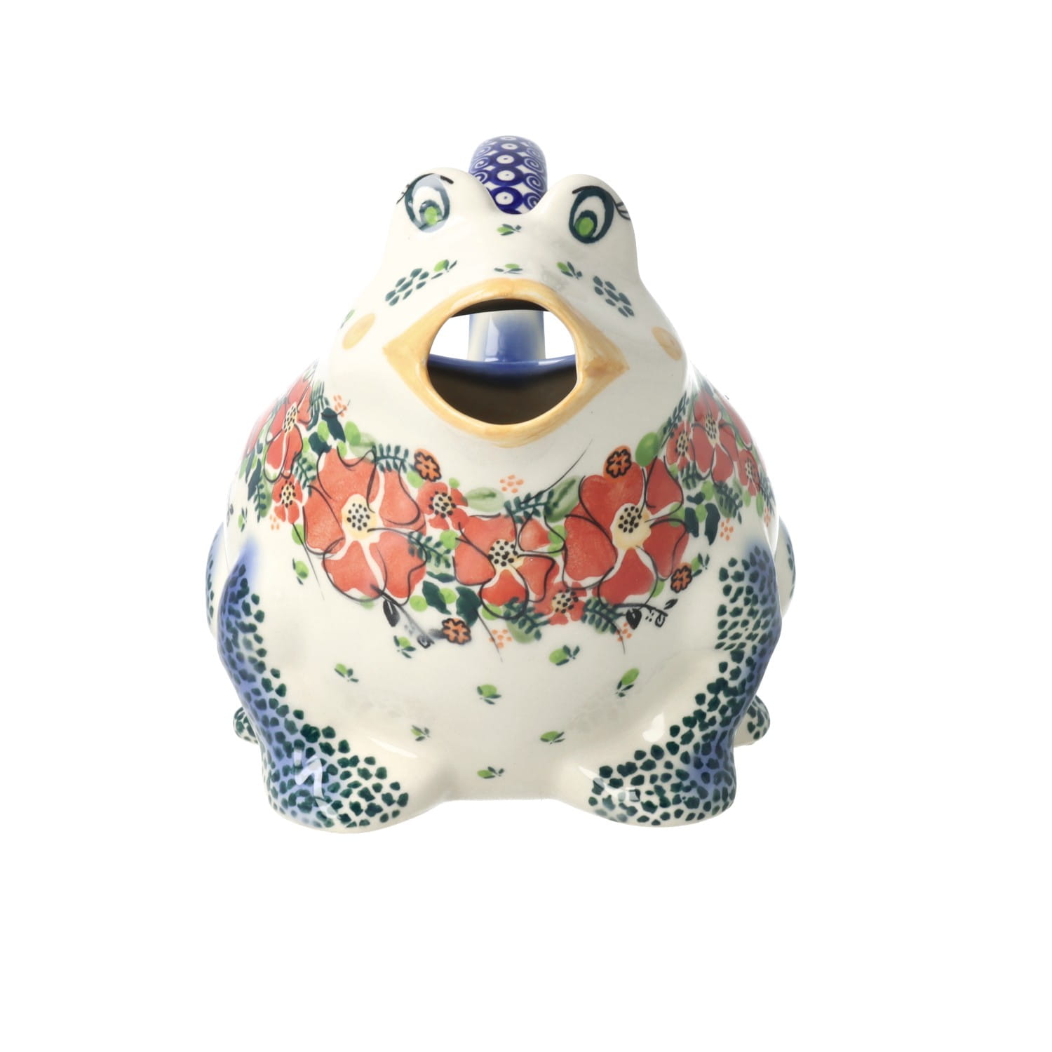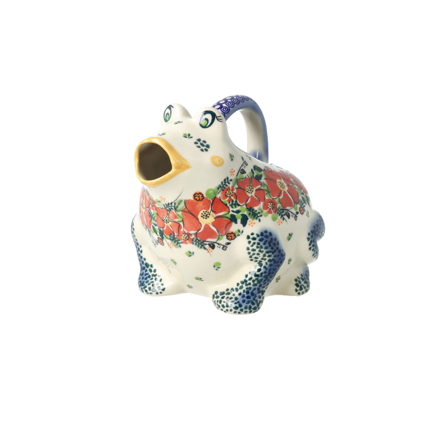 Urocza konewka w kształcie żaby. Posiada owalny otwór i poręczny uchwyt, które ułatwiają podlewanie roślin.