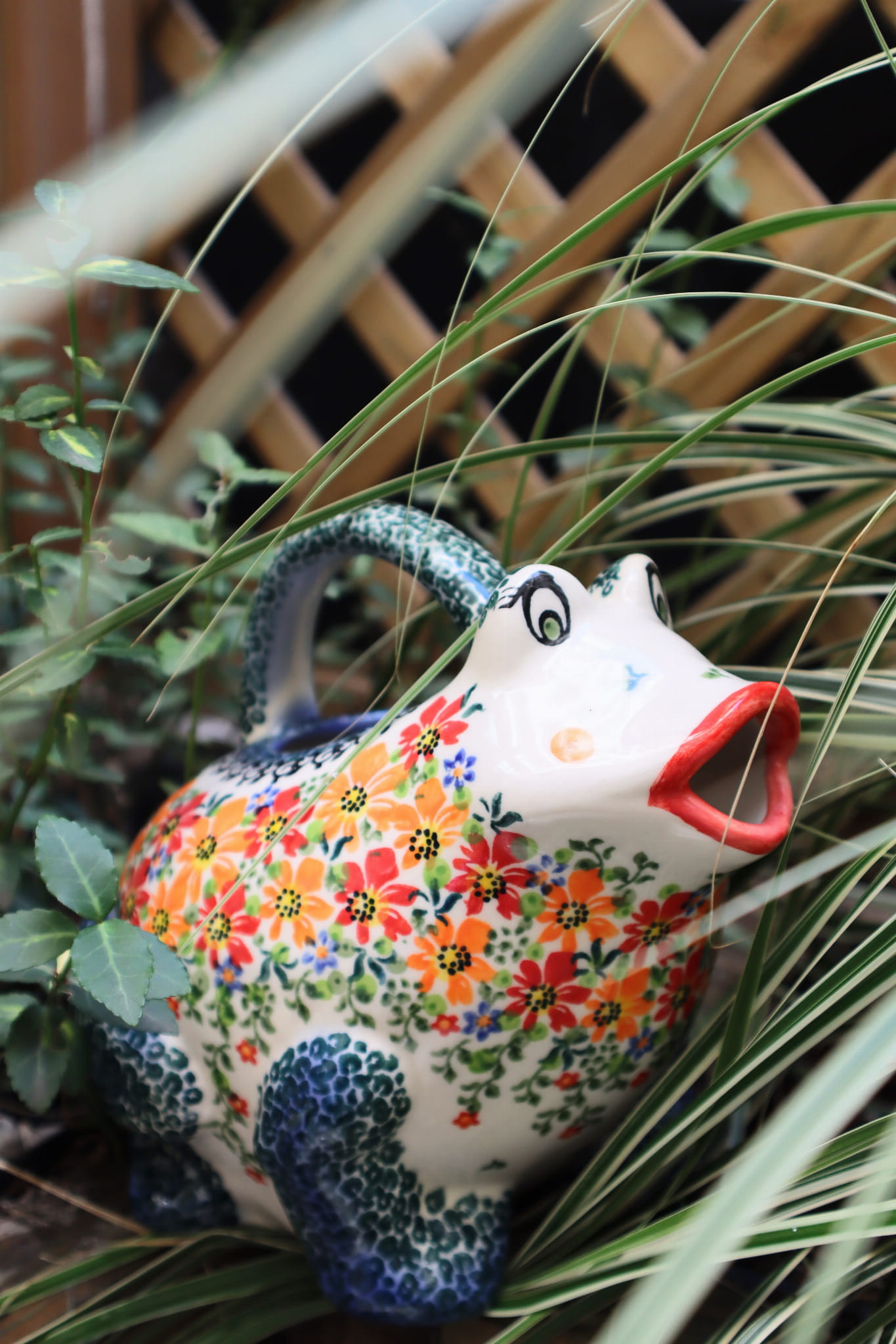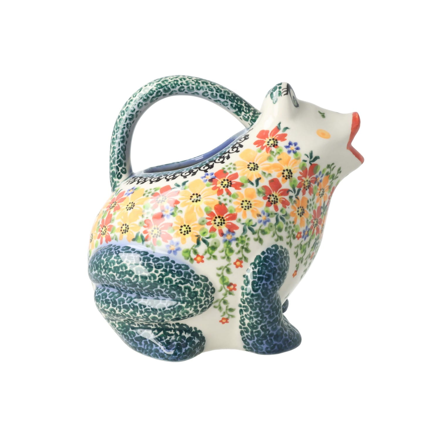 Urocza konewka w kształcie żaby. Posiada owalny otwór i poręczny uchwyt, które ułatwiają podlewanie roślin.
