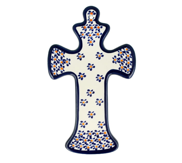 Płaski krzyż dekoracyjny z uchwytem do zawieszenia.