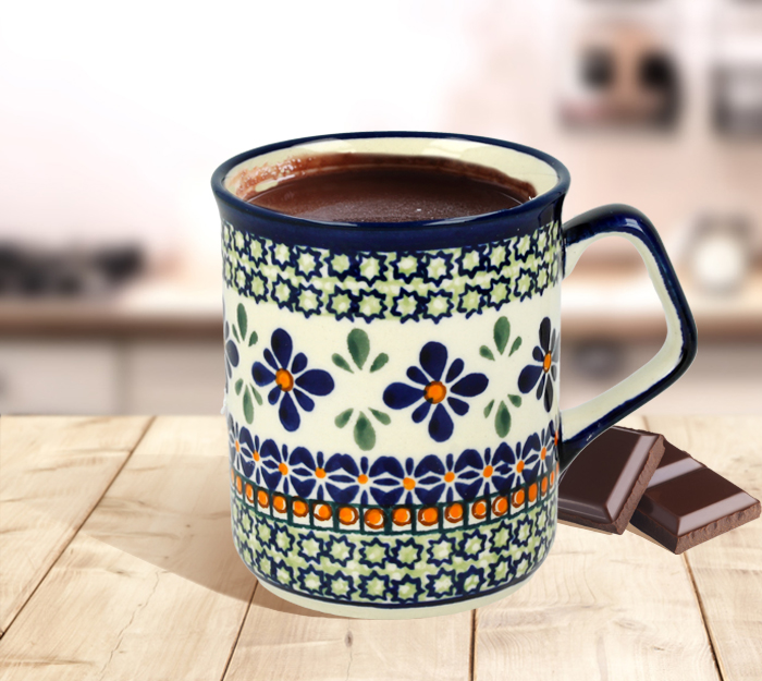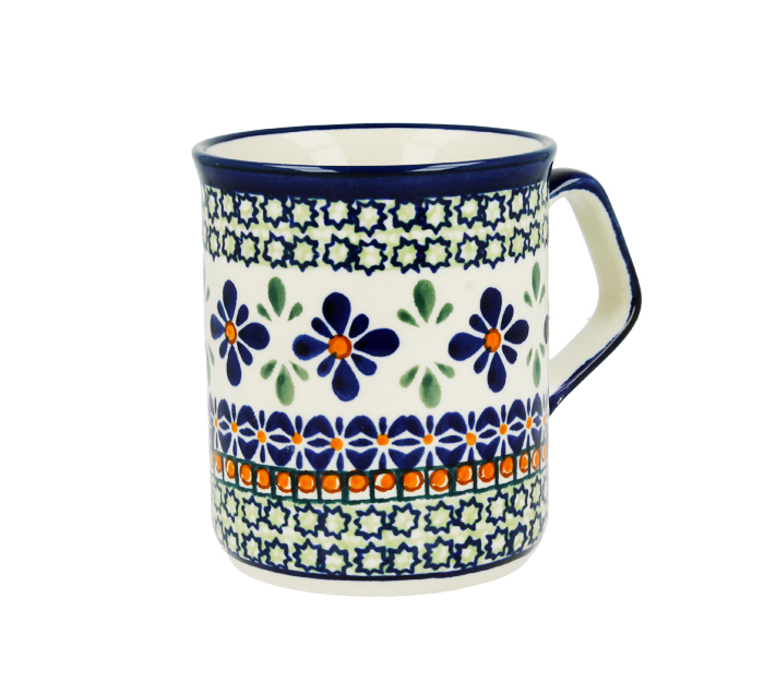 Prosty kubek z uchem w klasycznym kształcie. Produkt ręcznie formowany i dekorowany w Zakładach Ceramicznych Bolesławiec.