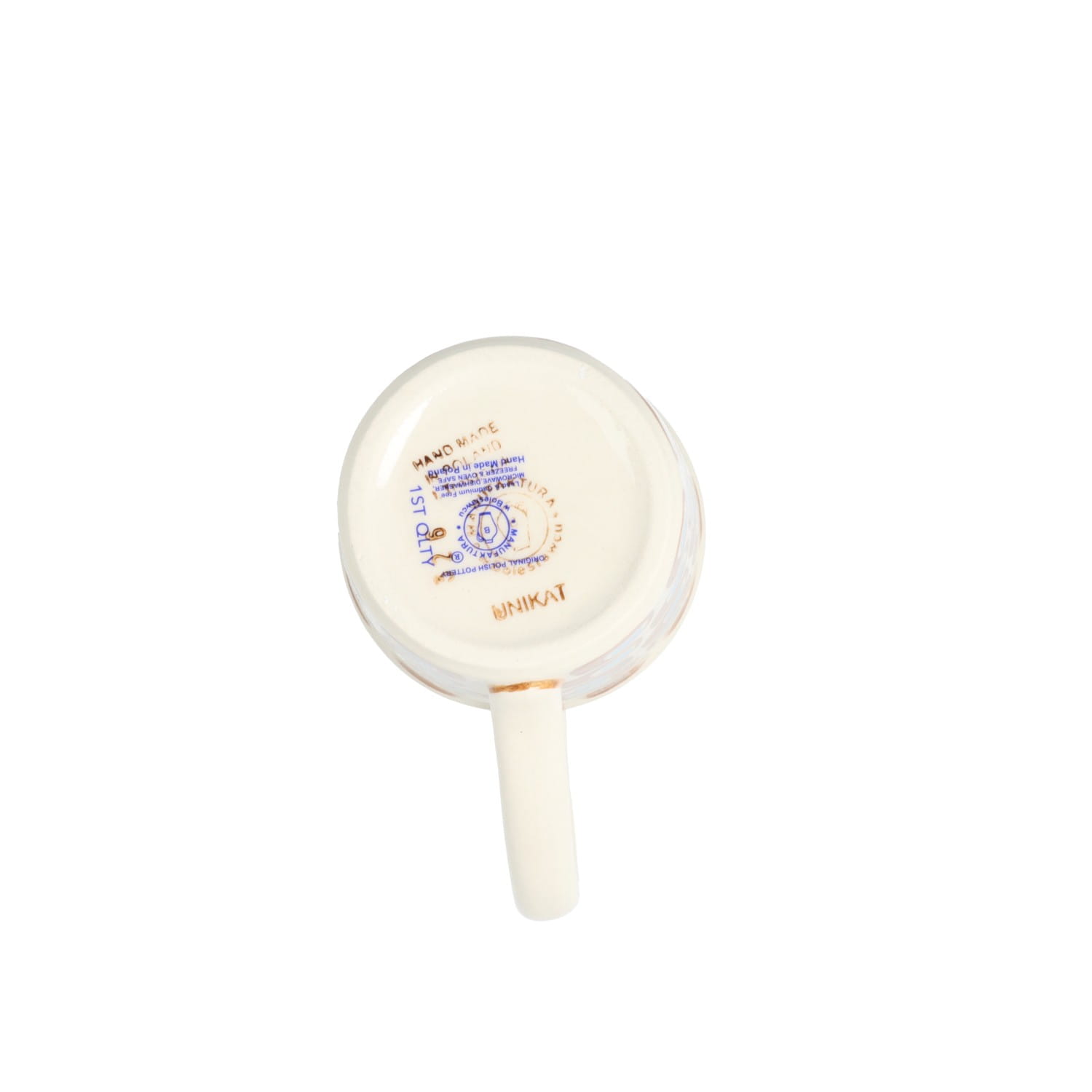 Mały kubek z profilowanym uchem. Produkt ręcznie formowany i dekorowany w Ceramice Artystycznej S.R.A. Bolesławiec.