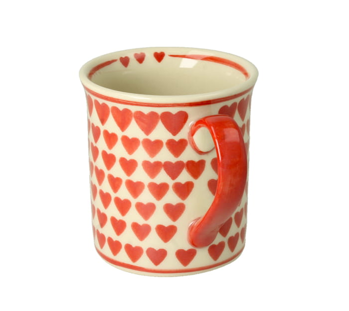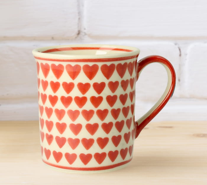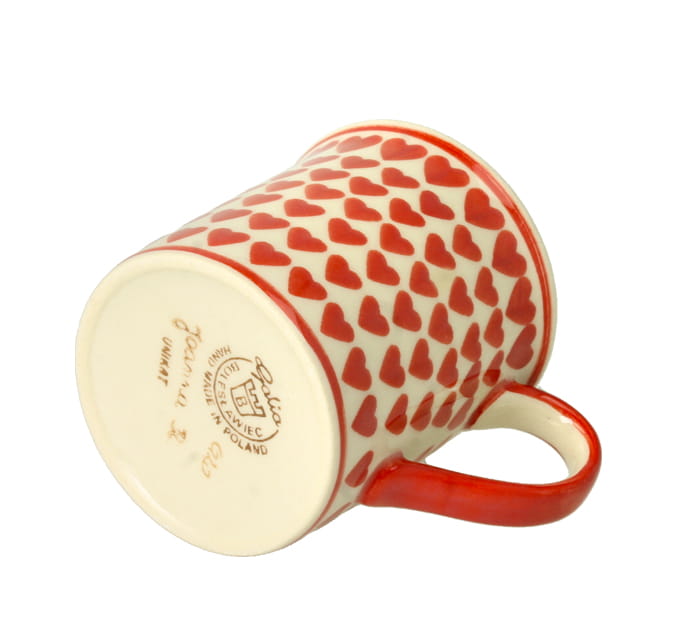 Kubek w serduszka. Produkt ręcznie formowany i dekorowany w Manufakturze Galia Bolesławiec.
