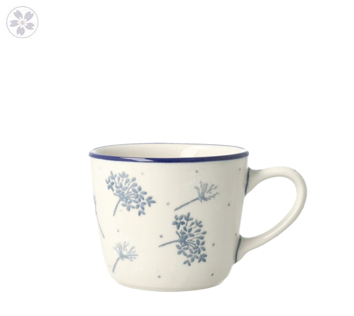 Kubek z motywem niebieskich kwiatów. Produkt ręcznie formowany i dekorowany w Manufakturze Galia Bolesławiec.