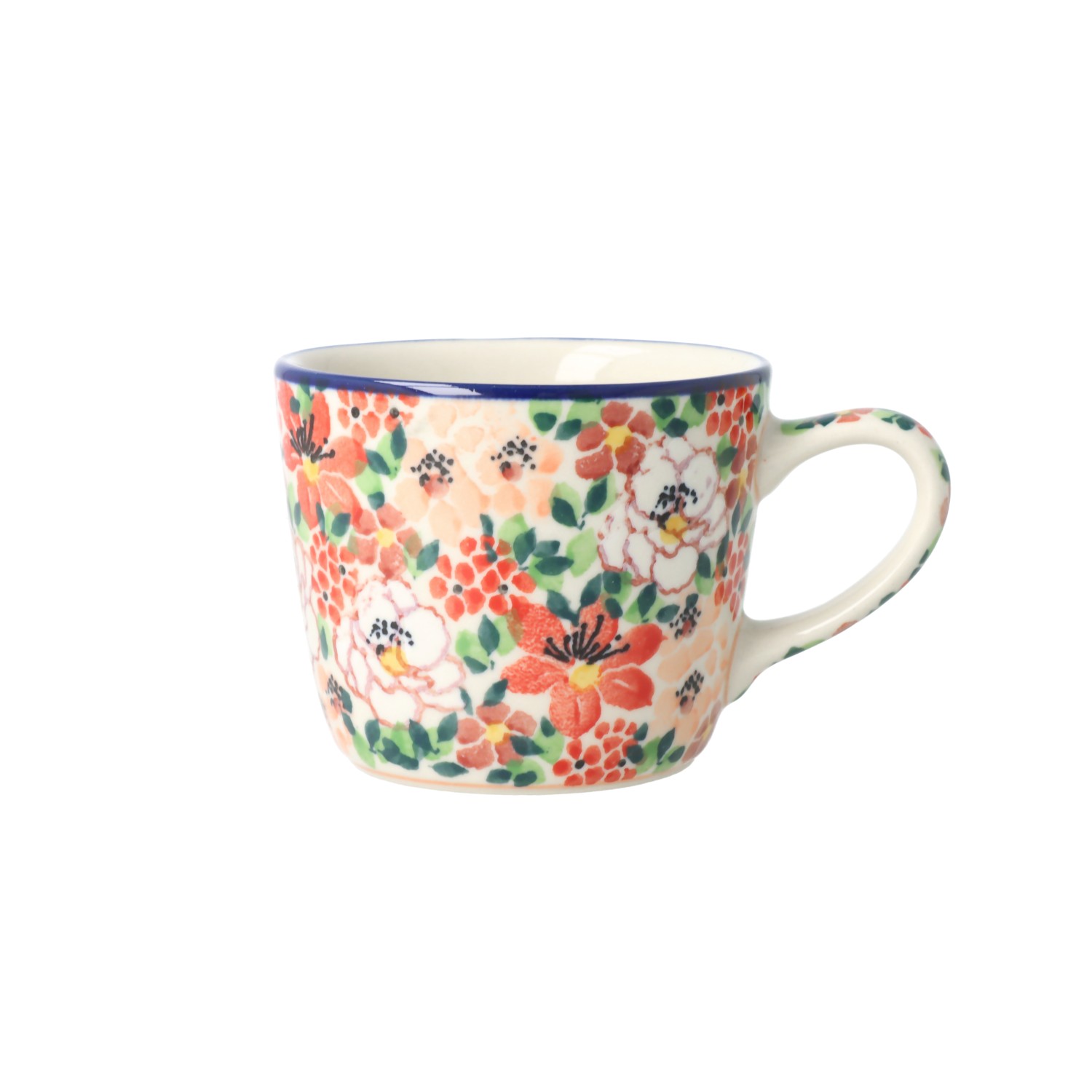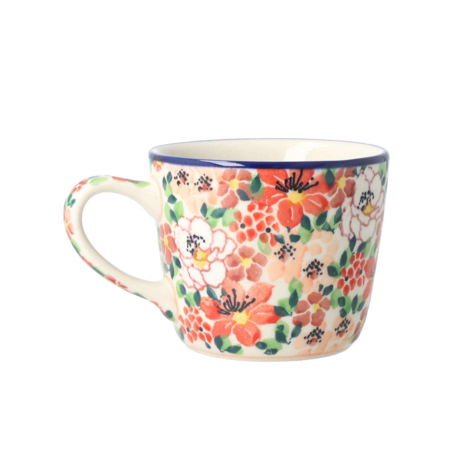 Mały kubek z profilowanym uchem. Produkt ręcznie formowany i dekorowany w Ceramice Artystycznej S.R.A. Bolesławiec.