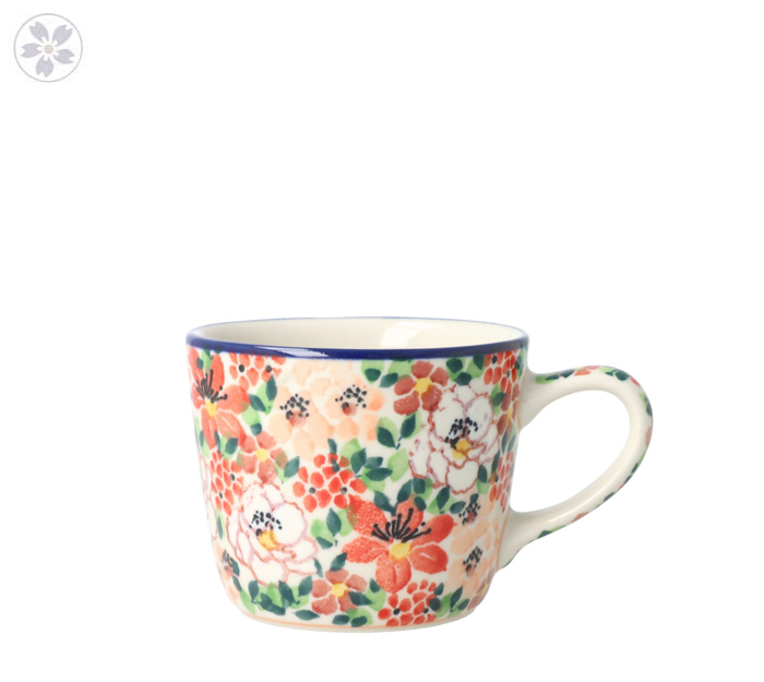 Kubek z motywem kwiatów. Produkt ręcznie formowany i dekorowany w Manufakturze Galia Bolesławiec.