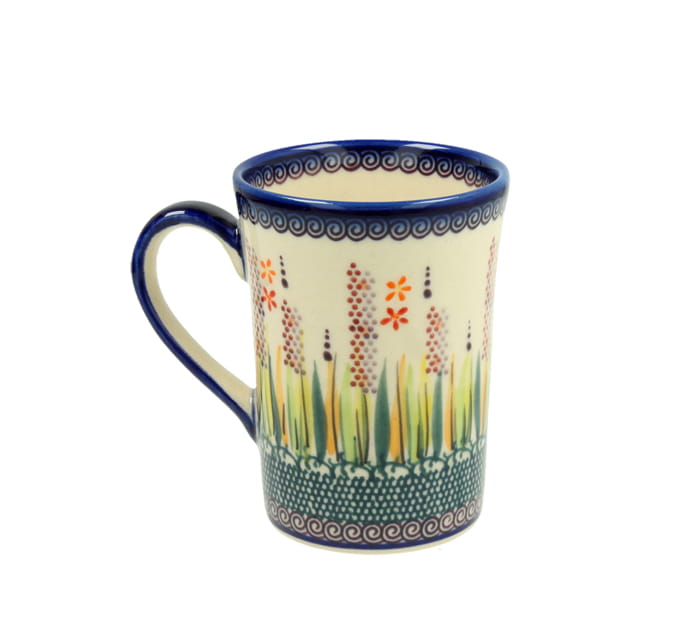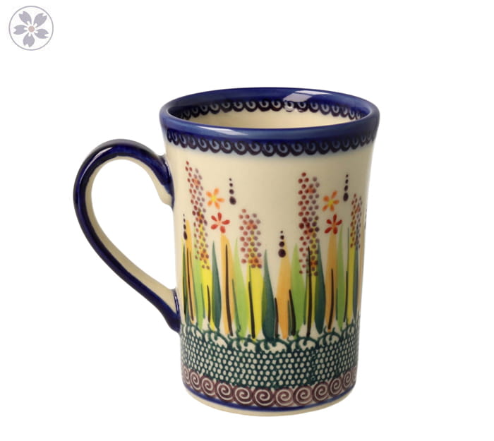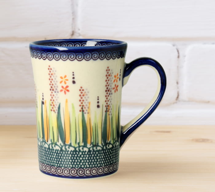 Kubek z profilowanym uchem. Produkt ręcznie formowany i dekorowany w Ceramice Artystycznej S.R.A. Bolesławiec.