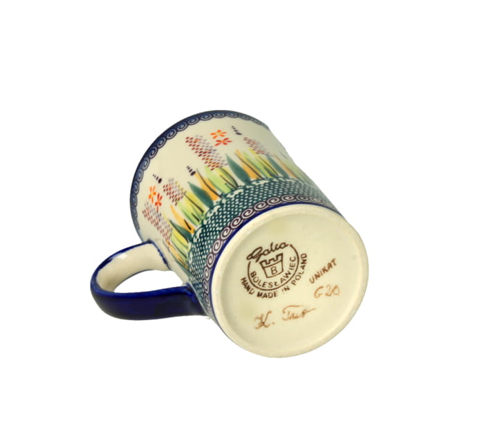 Duży kubek o pojemności 0,6 litra. Produkt ręcznie formowany i dekorowany w Manufakturze Galia Bolesławiec.