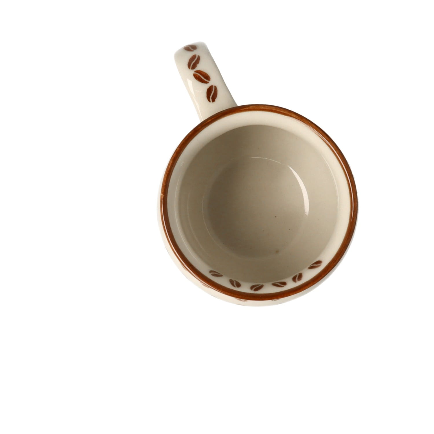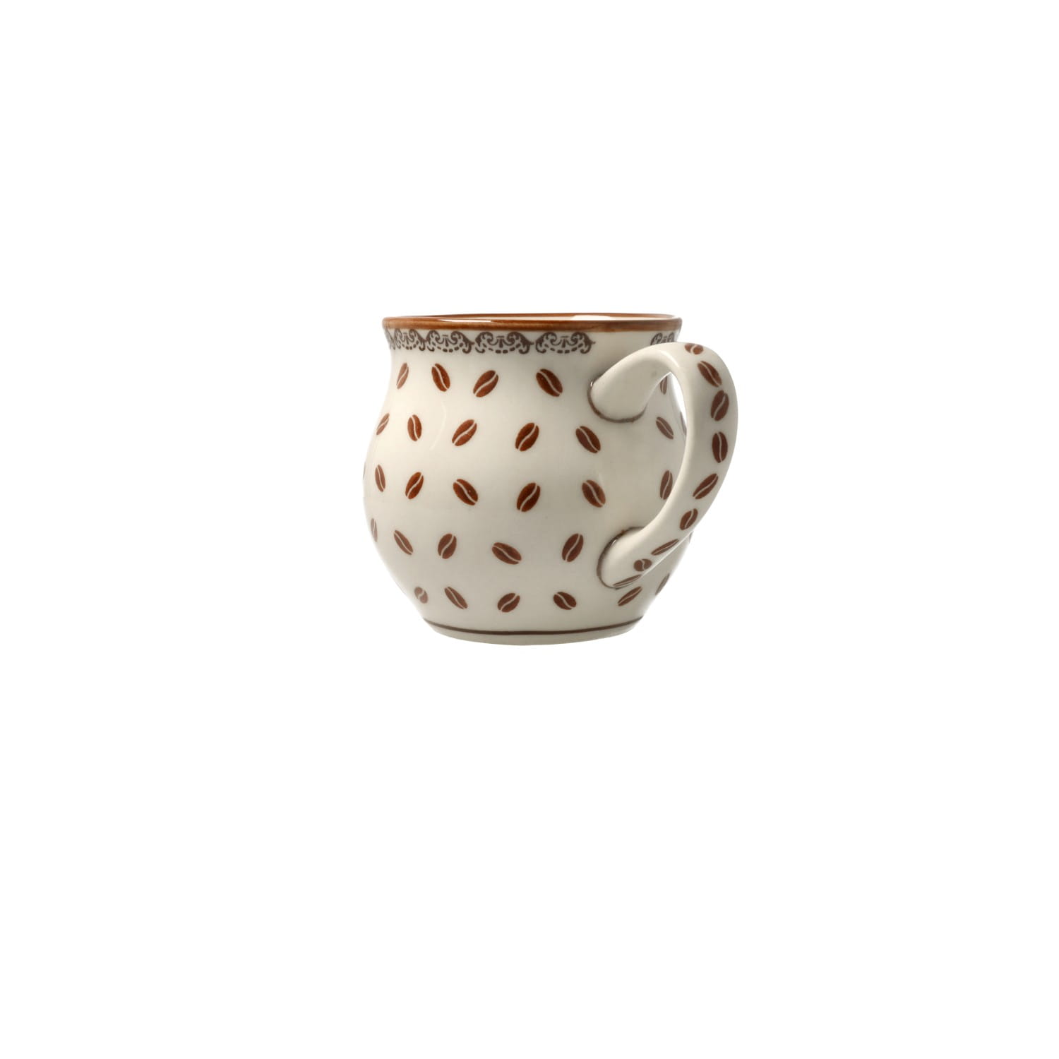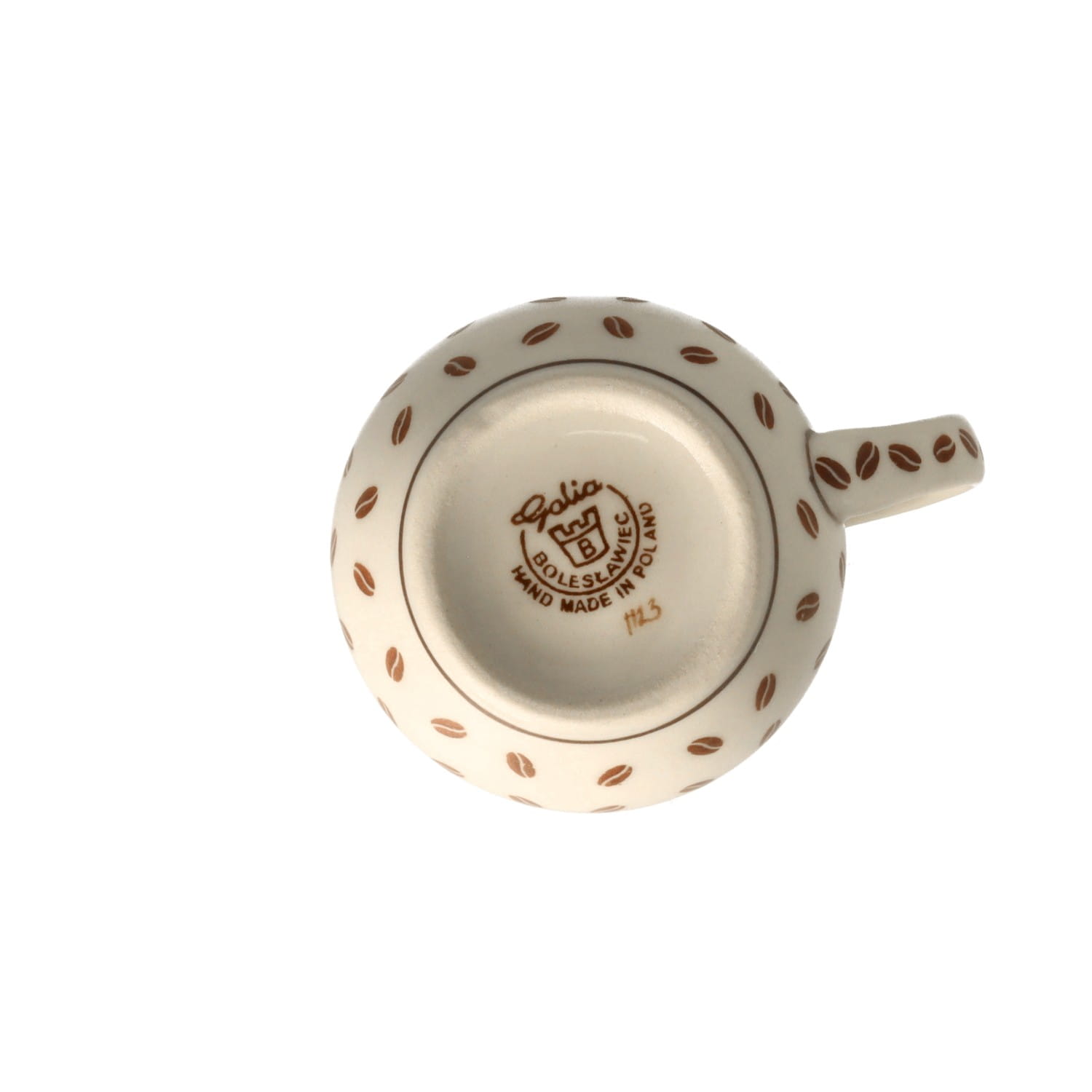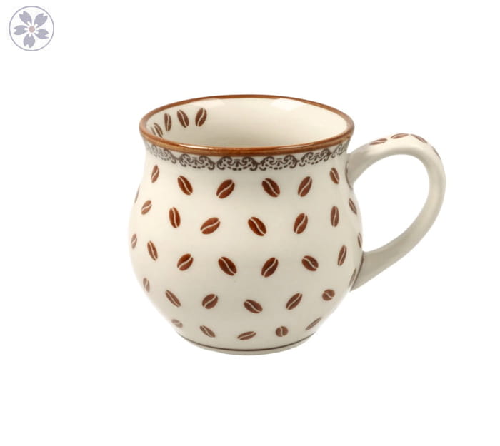 Kubek z motywem ziaren kawy. Produkt ręcznie formowany i dekorowany w Manufakturze Galia Bolesławiec.