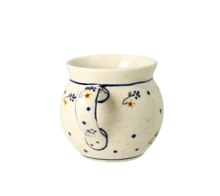 Mały kubek z profilowanym uchem. Produkt ręcznie formowany i dekorowany w Ceramice Artystycznej S.R.A. Bolesławiec.