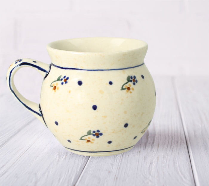 Kubek z uchem w klasycznym kształcie. Produkt ręcznie formowany i dekorowany w Zakładach Ceramicznych Bolesławiec.