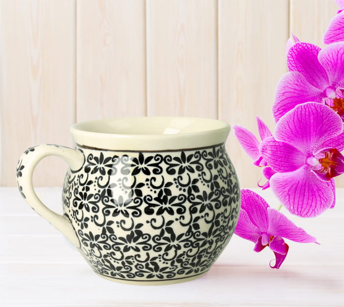 Kubek z uchem w klasycznym kształcie. Produkt ręcznie formowany i dekorowany w Zakładach Ceramicznych Bolesławiec.