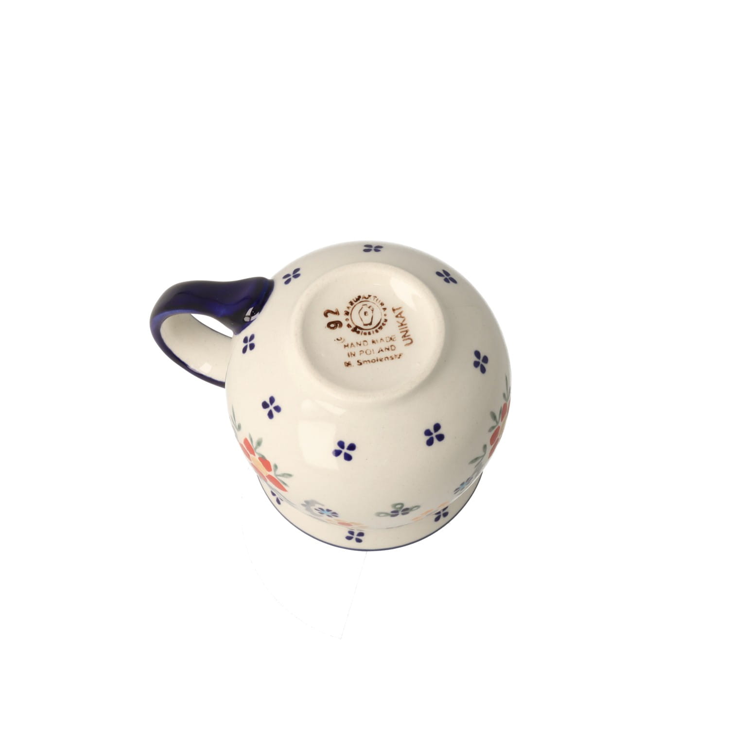 Kubek z profilowanym uchem. Produkt ręcznie formowany i dekorowany w Ceramice Artystycznej S.R.A. Bolesławiec.