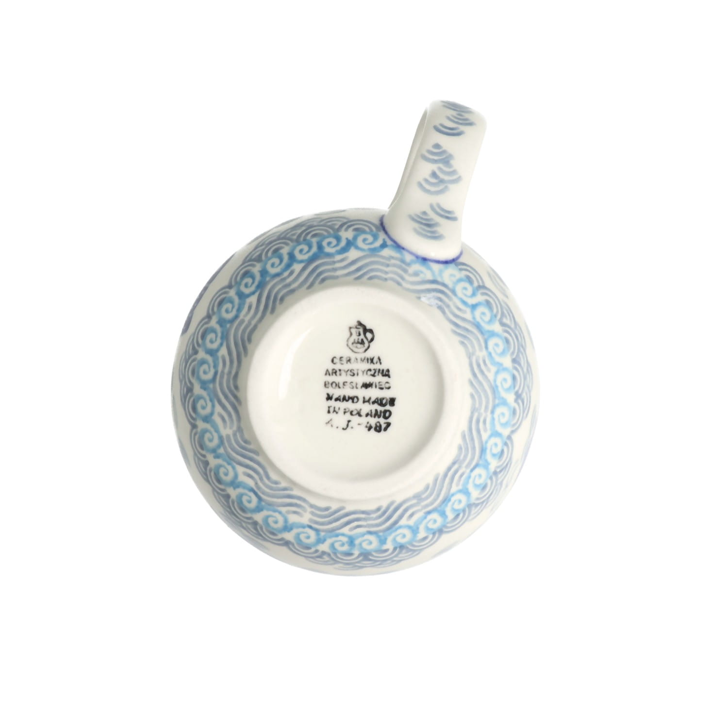 Mały kubek z profilowanym uchem. Produkt ręcznie formowany i dekorowany w Ceramice Artystycznej S.R.A. Bolesławiec.