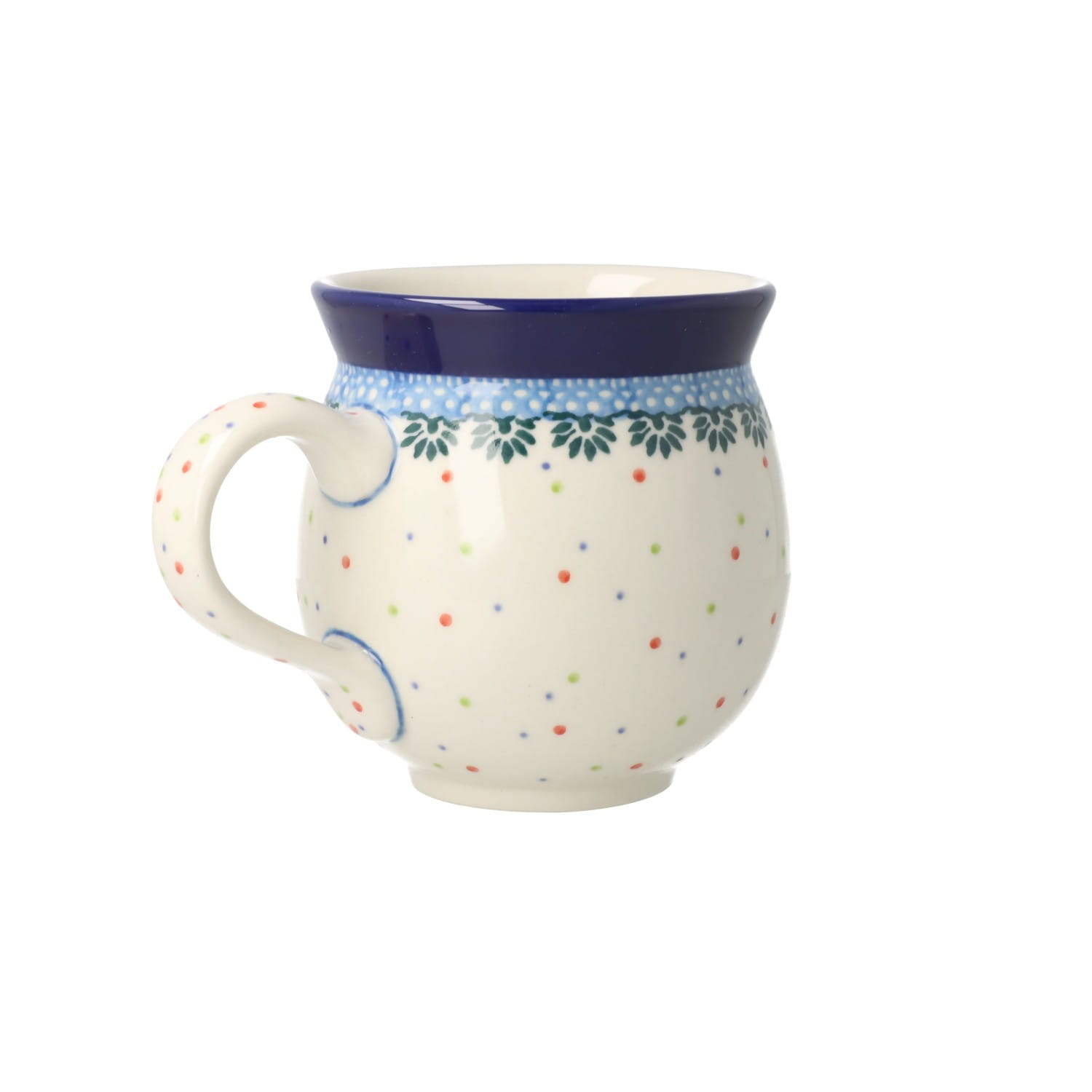 Klasyczny kubek z profilowanym uchem. Produkt ręcznie formowany i dekorowany w Ceramice Artystycznej S.R.A. Bolesławiec.