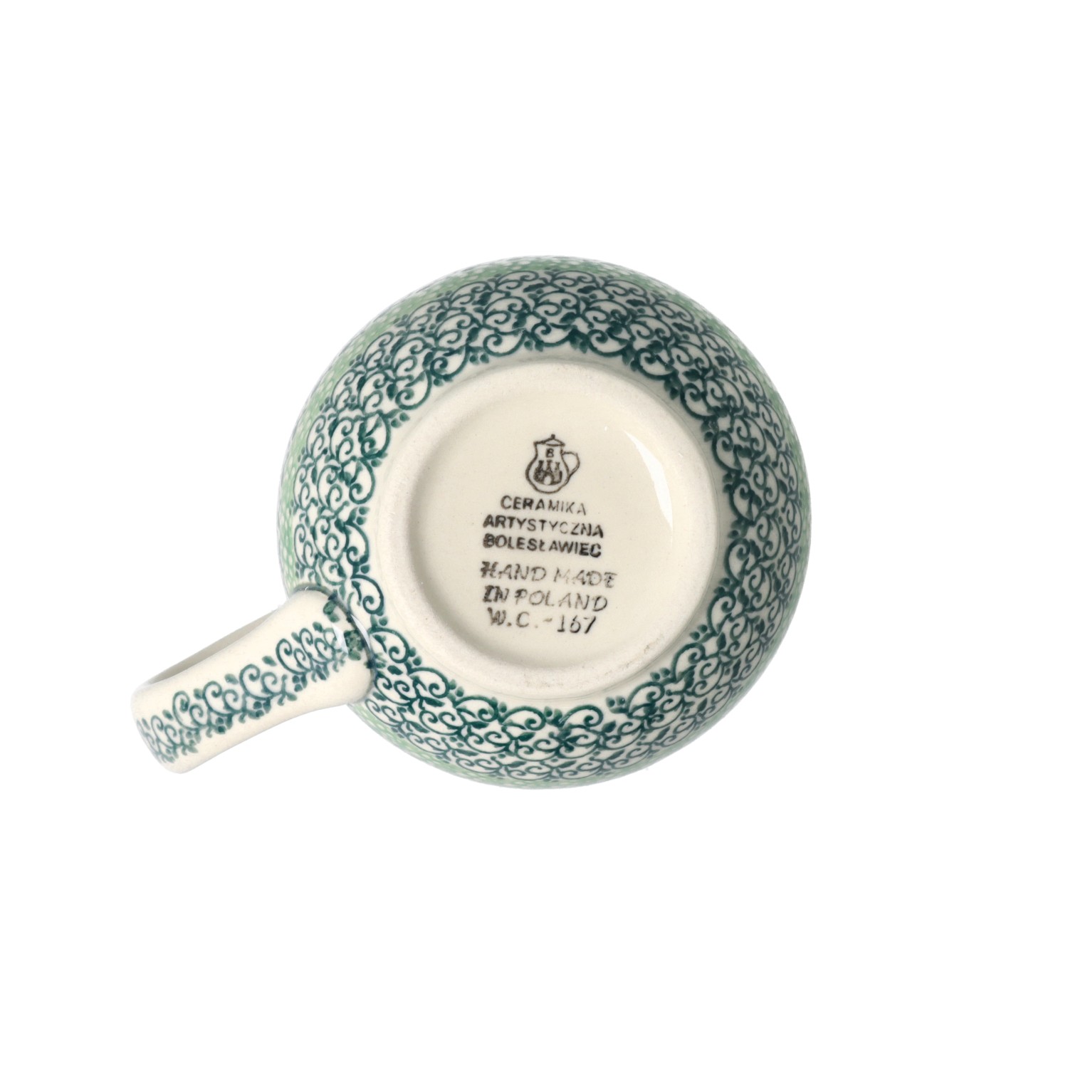 Kubek z motywem zielonych kwiató. Produkt ręcznie formowany i dekorowany w Manufakturze Galia Bolesławiec.