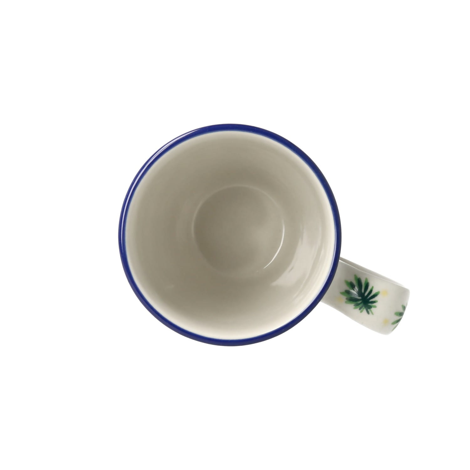 Kubek z motywem zielonych kwiató. Produkt ręcznie formowany i dekorowany w Manufakturze Galia Bolesławiec.