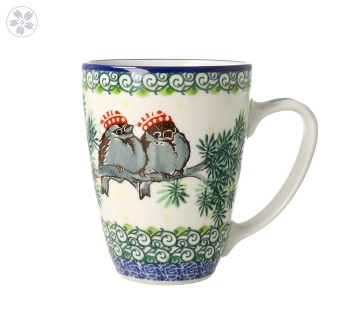 Kubek z motywem świątecznym. Produkt ręcznie formowany i dekorowany w Manufakturze Galia Bolesławiec.