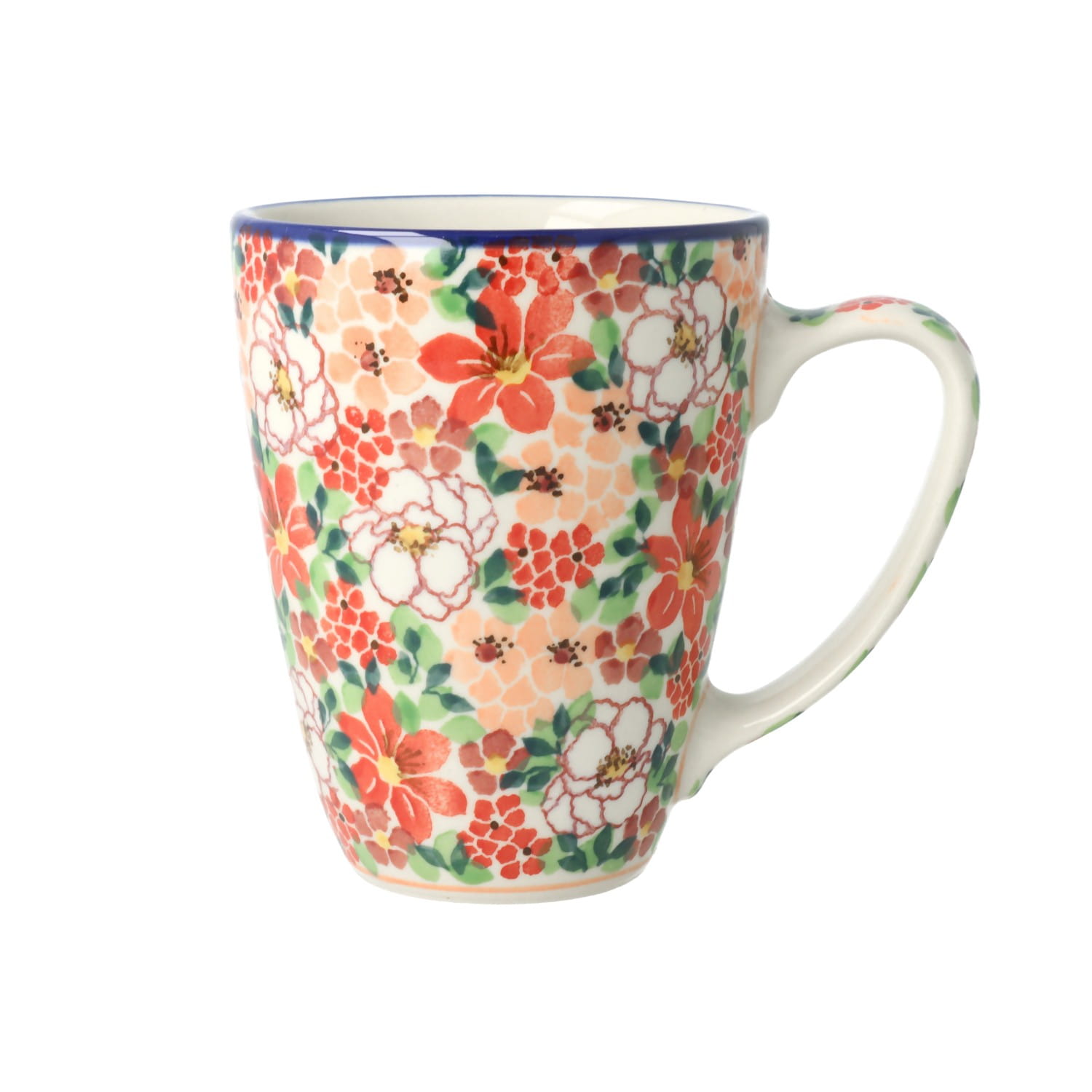 Kubek z uchem w klasycznym kształcie. Produkt ręcznie formowany i dekorowany w Zakładach Ceramicznych Bolesławiec.