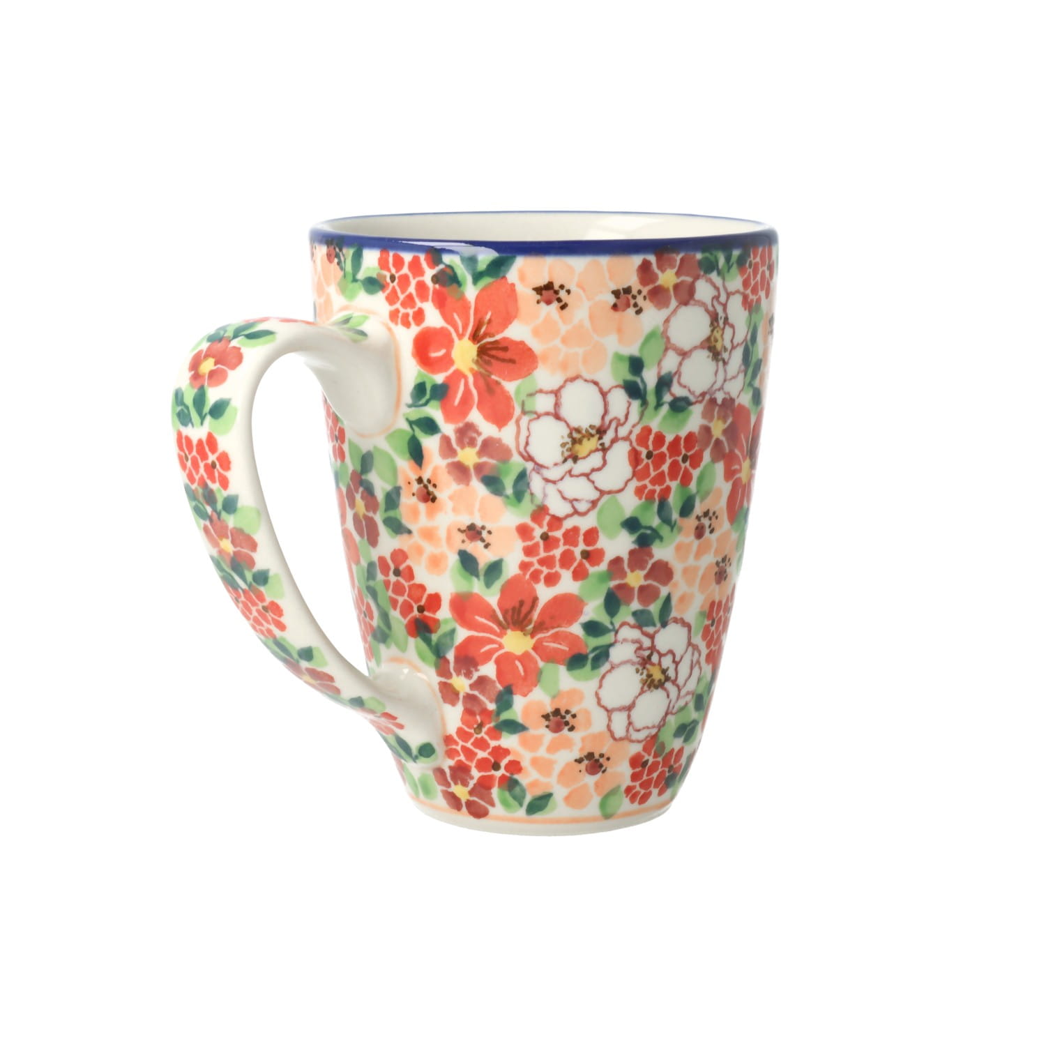 Klasyczny kubek z profilowanym uchem. Produkt ręcznie formowany i dekorowany w Ceramice Artystycznej S.R.A. Bolesławiec.