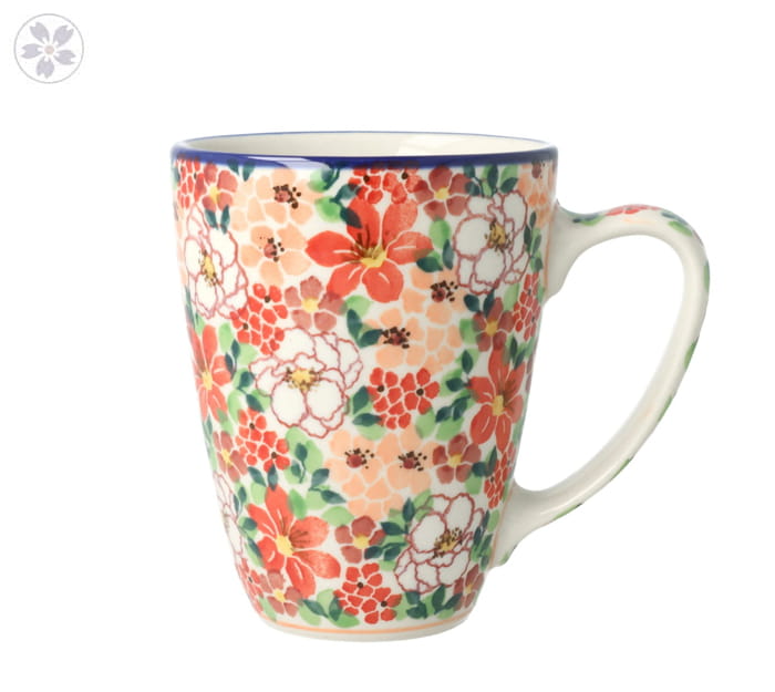 Kubek z motywem kwiatów. Produkt ręcznie formowany i dekorowany w Manufakturze Galia Bolesławiec.