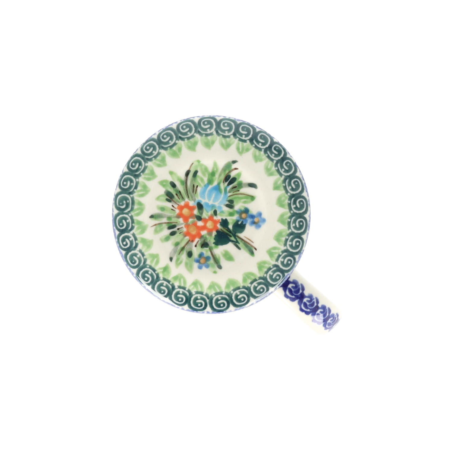 Mały kubek z profilowanym uchem. Produkt ręcznie formowany i dekorowany w Ceramice Artystycznej S.R.A. Bolesławiec.